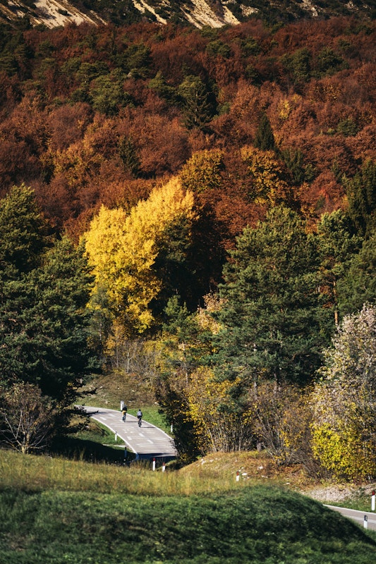 These are magical moments, the autumn foliage is at its peak, the sky is blue, and before us only the descent that leads us to the Giudicarie. At Spiazzo Rendena, we take some refreshments before tackling one of the most beautiful climbs in Trentino: the Daone Pass.