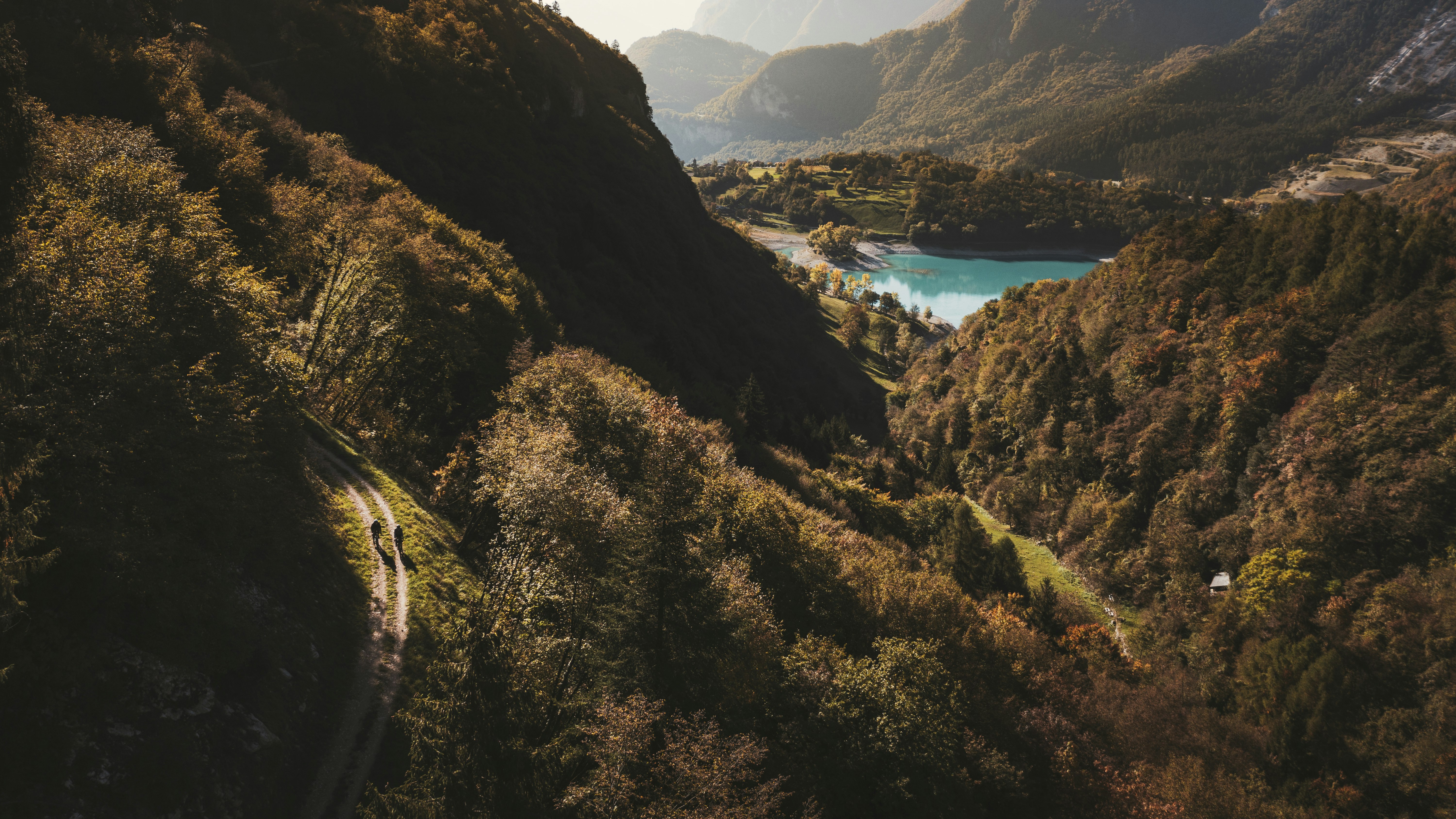 It is done and it is only 2:30 p.m. So we decide that we have not had enough and we set ourselves another goal for the evening. We still have three hours of daylight, a breathtaking descent to Preore and then another gentle climb through Ponte Arche, Comano Terme, Fiavè and finally up to the Ballino pass. It doesn’t seem real, the dirt road that reaches the emerald Lake Tenno is something incredible, a continuous dance of light, one bend after another.