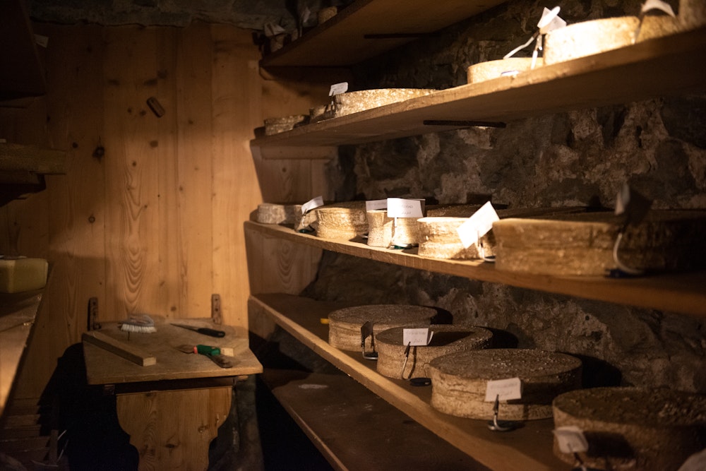The time has come to return off-road. We take a sharply pitched dirt road to the left — stones, rocks and streams alternate with short paved sections. We soon discover that we are still in the middle of a large pasture. Once more - and with no little finesse - we slalom our gravel bikes between one cow and another to reach the Andossi plateau, where in an alpine hut the cheesemaker we mentioned earlier is waiting for us. It is here that he lives and works every day. He tells us a thousand stories about his business, and talks with great pride about an important collaboration with Milan’s Bicocca University. In fact, a laboratory is based here in the summer to study the subsoil, which has limestone origins and is rich in underground caves.