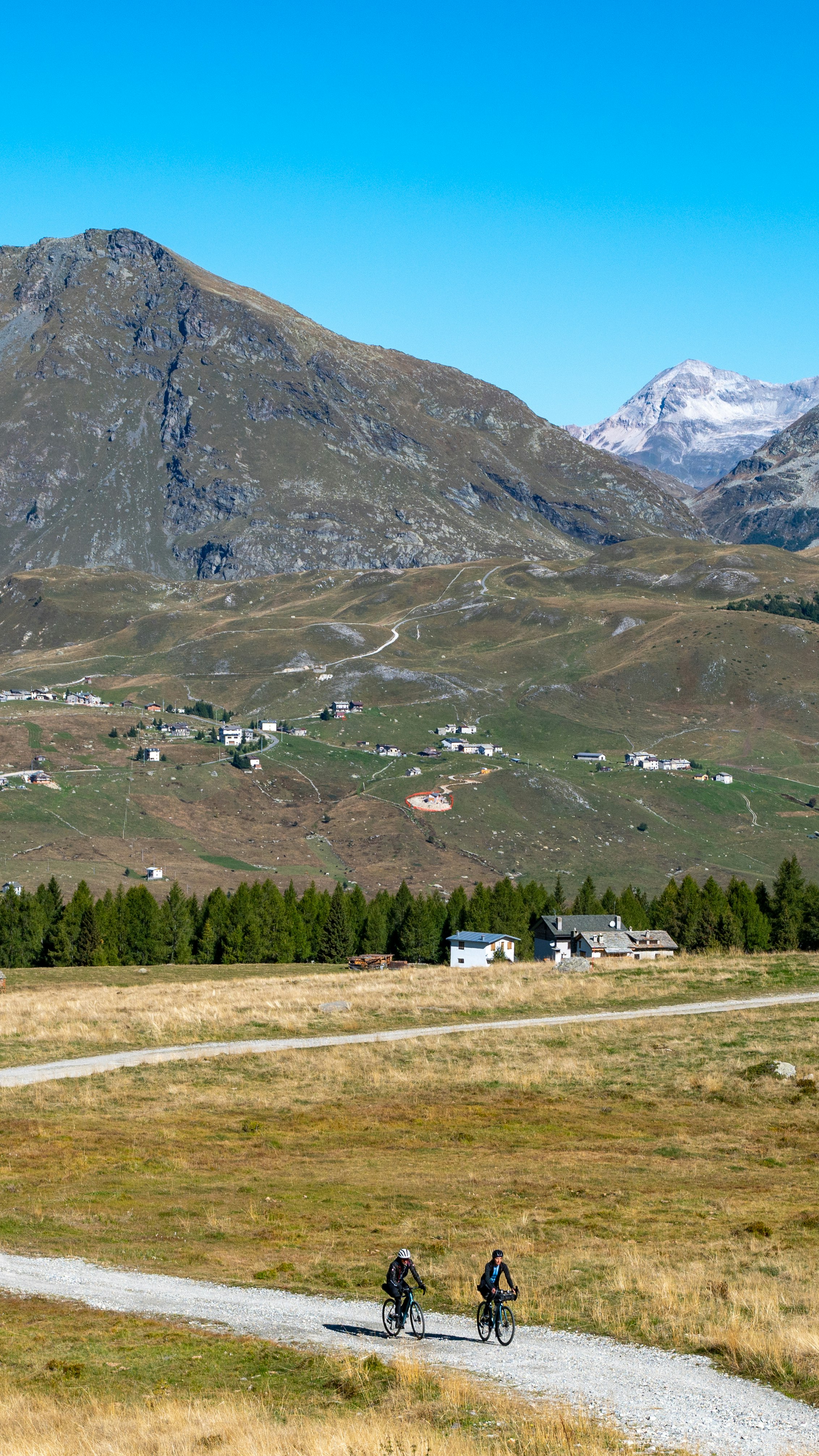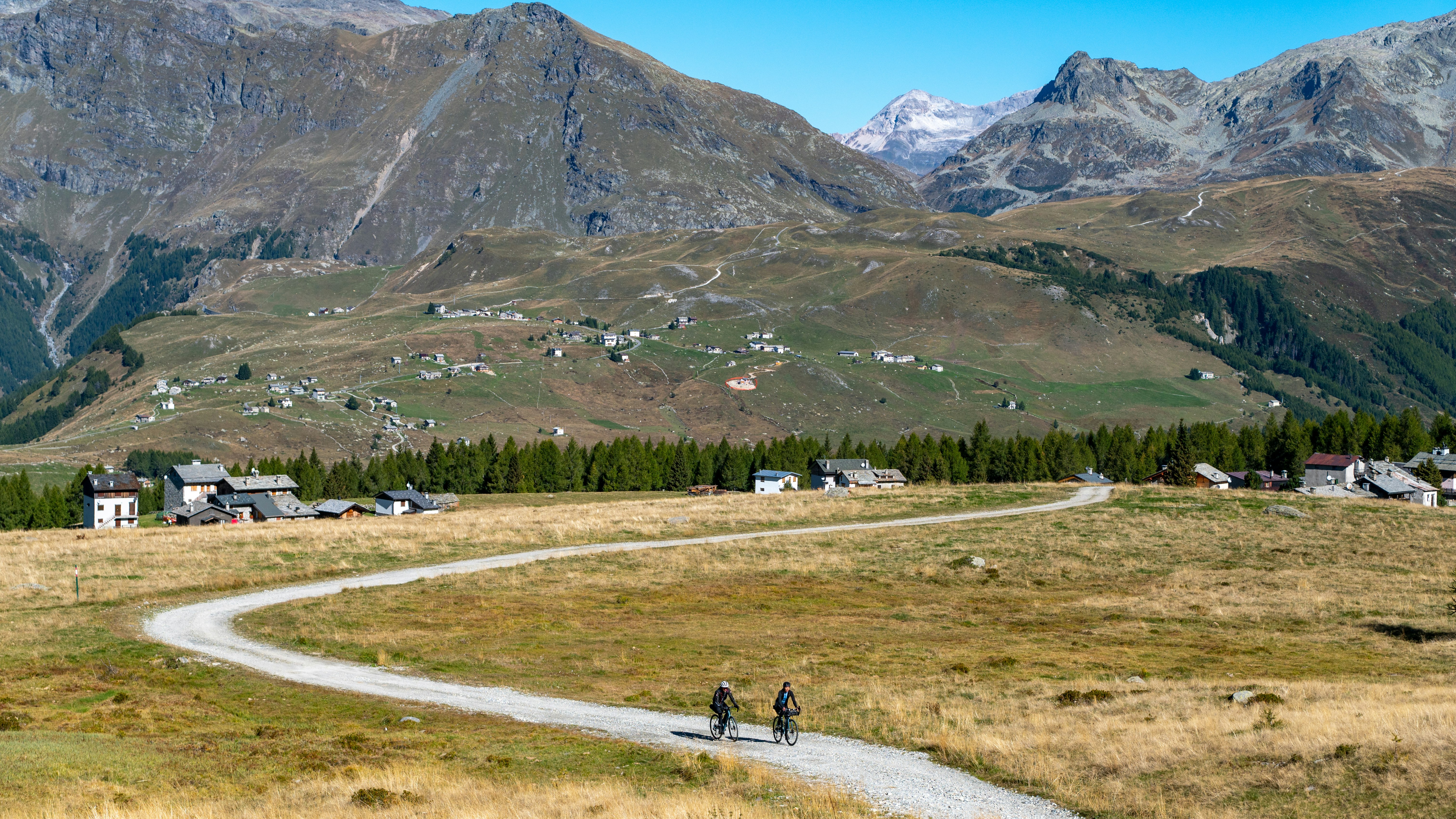 We pass through Campodolcino and then reach Madesimo, at an altitude of 1,555 metres. The sun has risen and the temperatures have become milder. The plateau on which the well-known Alta Valle Spluga ski resort stands is populated by hundreds of cows. In the off-season, there are far more of them than there are residents. We ride among them, trying not to disturb the animals too much, but not to fall over ourselves either. There are beautiful creatures of all breeds: spotted, black or red. A cheesemaker later tells us that their milk is used to make the highly prized Bitto cheese — but only if they graze above 1,600 metres.