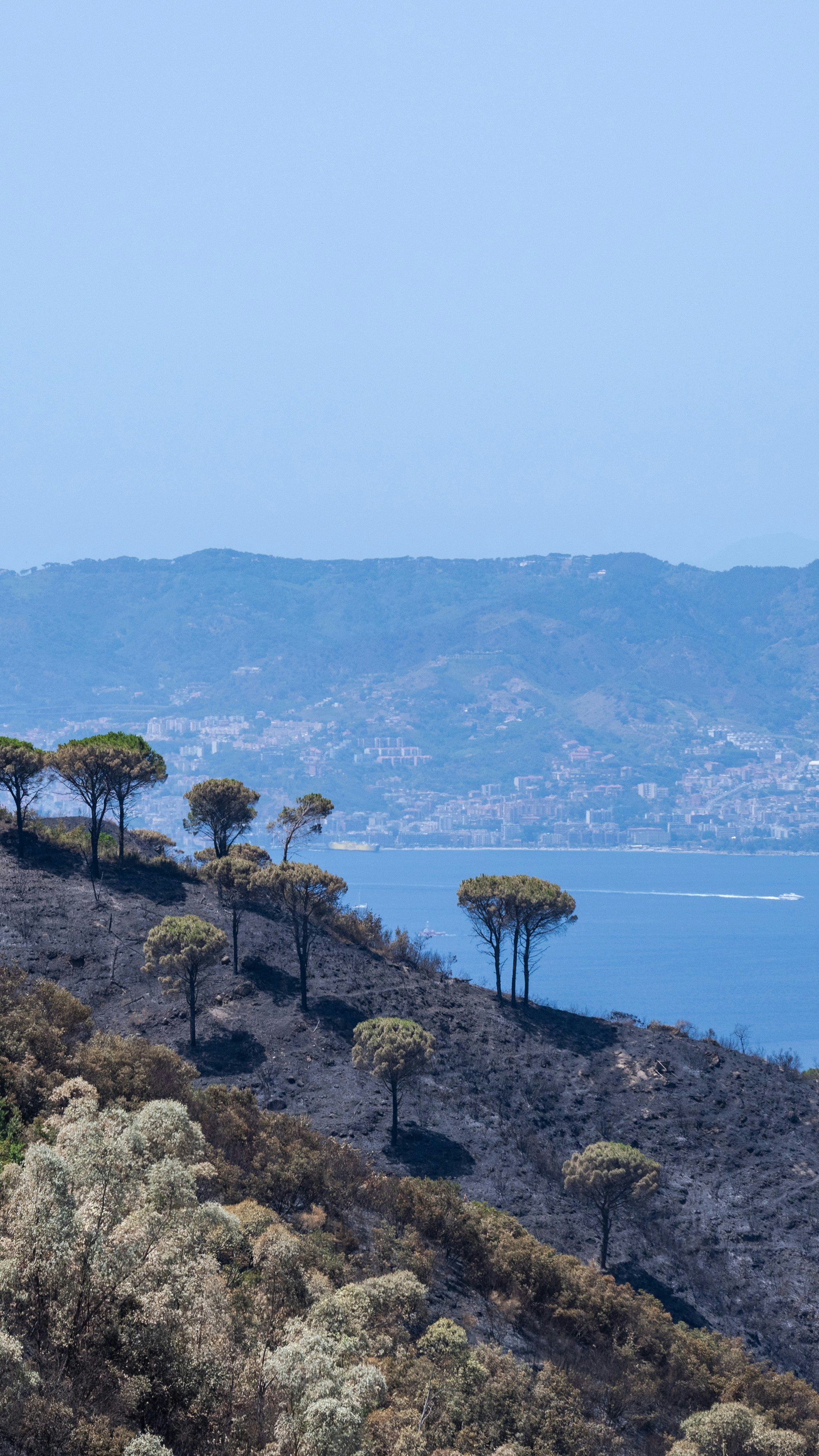 Here it is. Even the hills and mountains are fed up with travelling and finally decide to dive into the sea. In front of us we see Sicily with Mount Etna peeping through the clouds, the blue colours of the sky and the sea blend into oneanother and seem to be born of the same mother, identical twins, separated at birth. The strait that divides these two lands seems irrelevant.