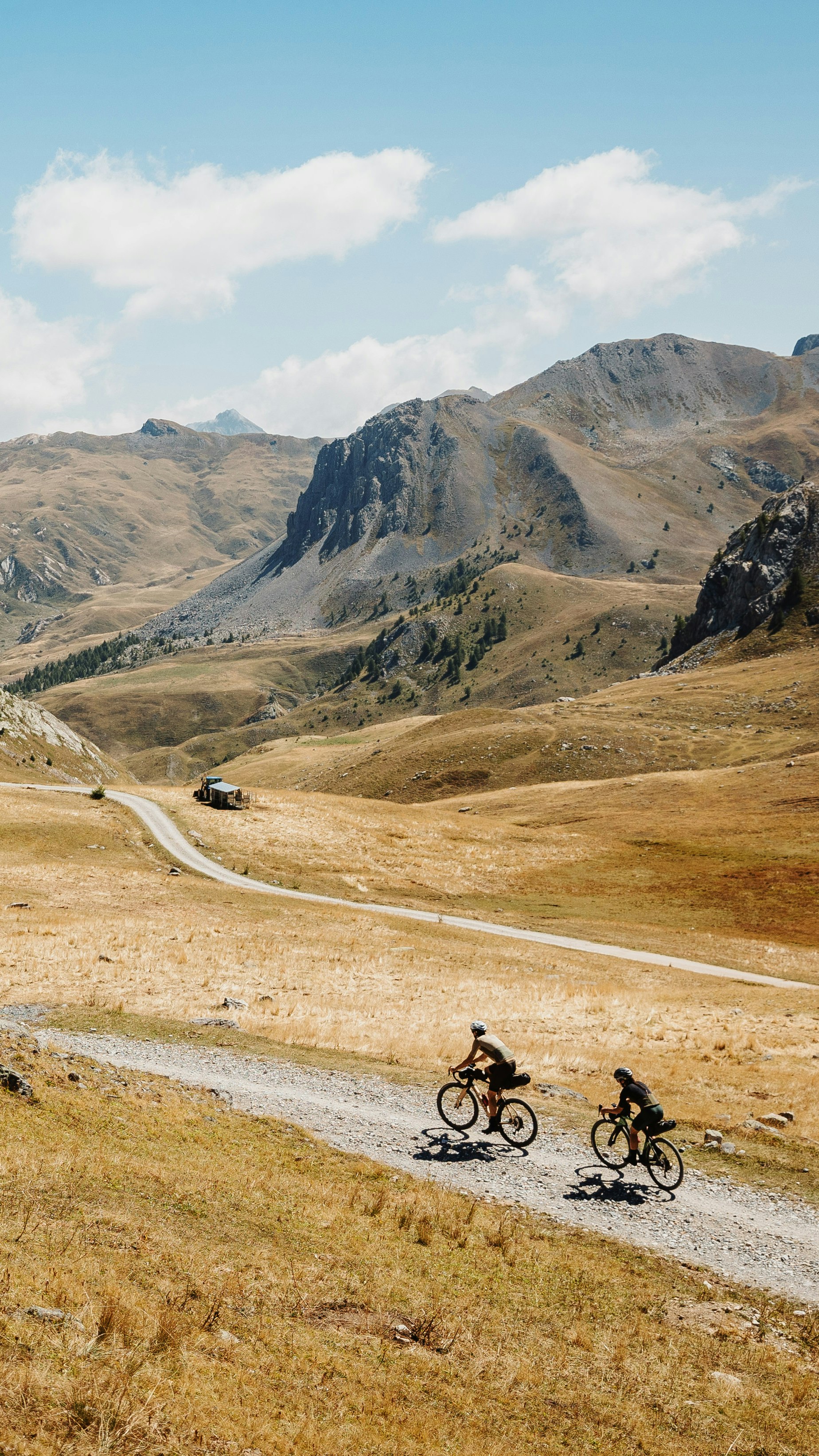 One of the most beautiful things about cycling is how it transforms stuff one would never do into something totally ordinary. We liked the sunset over Sampeyre so much that, this morning, on our bikes and with our lights on, we went back there to enjoy the sunrise. The light of dawn tinges of pink everything it touches: the stones, the peaks, the meadows and the clouds in the sky. We take our time and wait from up here for the day to start, warming our hands with the hot tea we brought with us. Around eight o’clock we start to go down the long descent to Stroppo. We speed by the churches, with doors still closed, scattered in the small towns towards the bottom of the valley. We speed past mountain hamlets that are still asleep. These are the first school days and in Stroppo, and from the windows of the Convitto boarding school – a historical reference point for the area and the last institute in the province of Cuneo that provides overnight accommodation for the valley’s students – the jolly hubbub of students can be heard. After a few kilometres we arrive at Ponte Marmora, easily recognisable for its hydroelectric power station; we turn left and head towards Marmora and Canosio. The road runs close to the river, suspended over deep escarpments. At regular intervals we pass through tunnels carved into the rock: the echo of our chatter spreads across the mountains. At Marmora, we turn right towards Canosio, where a village of Indian tents evokes the Native American nights on the Great Plains of the northern United States, in close contact with nature. We would like to stop, but instead we cycle on. There’s a gorge in the valley that leads us to the Piano del Preit: the road up is very exposed and big drops of sweat begin to bead on our foreheads. As we climb towards the pass, the imposing outline of Monte Cassorso appears on our right. The asphalt ends and a stretch of dirt road climbs up to the Altipiano della Gardetta and the Rifugio that takes its name.