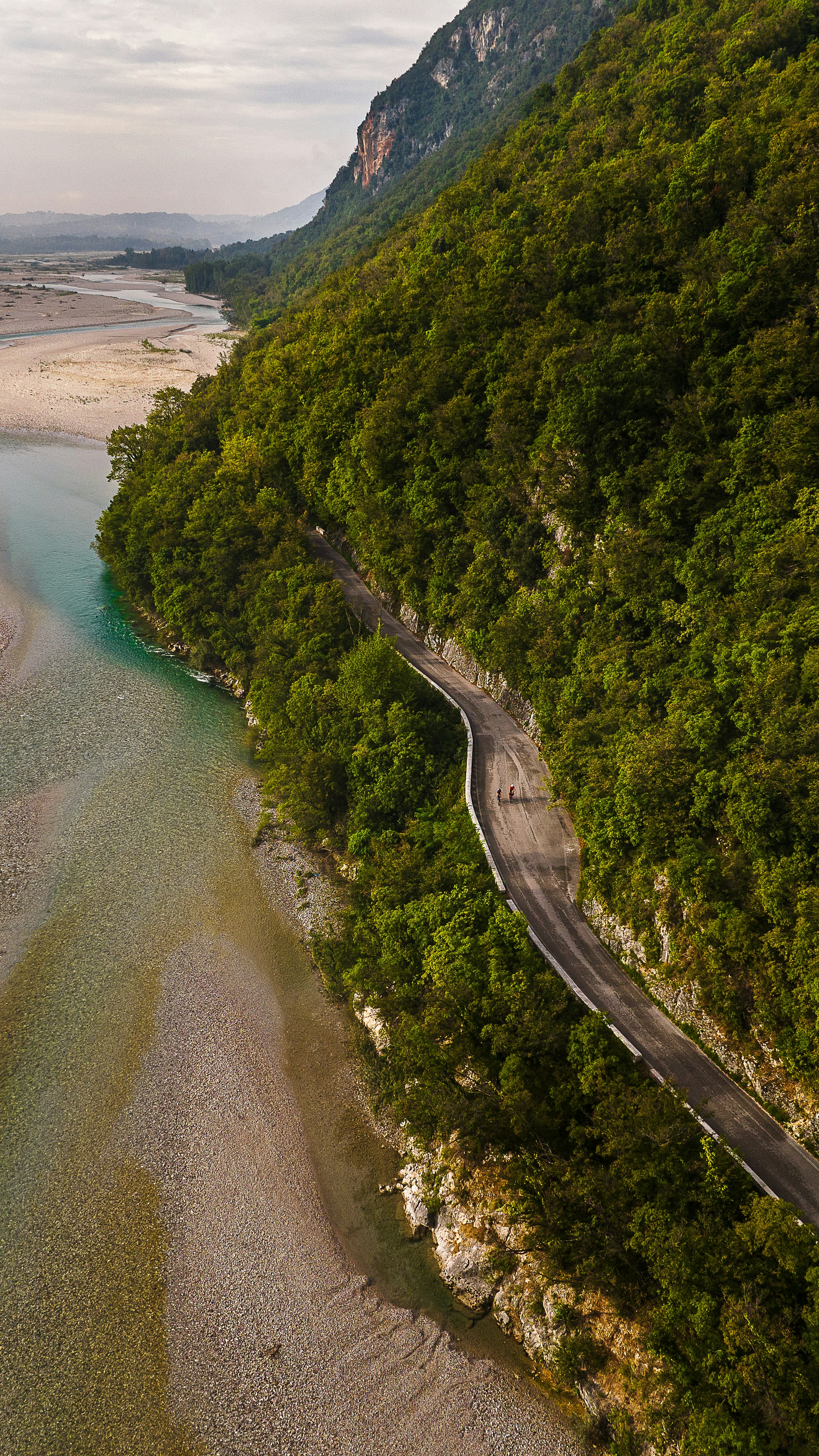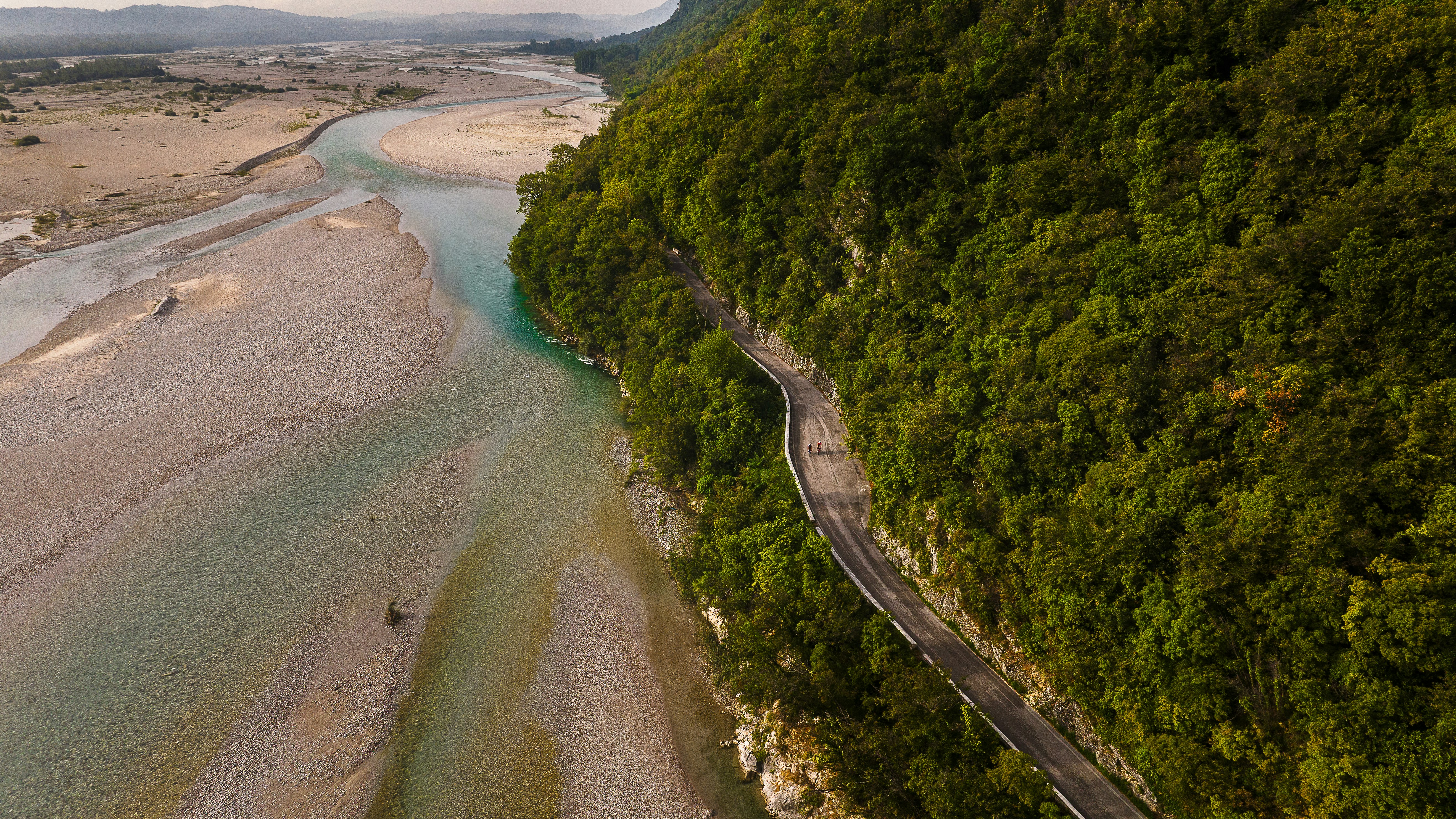 The next intersection leads onto the road that runs along the right bank of the river and can be considered, to all effects, the cyclists’ road par excellence: it is no coincidence that its name is Via Ottavio Bottecchia. At first it looks like a wide road, with incredibly few cars, a straight stretch where, if you are with other cyclist, you can even indulge in high-speed, with almost double-file exchanges. Once past an overpass, with the Tagliamento flowing on the left and the rocky mountain watching you on the right, the roadway narrows and a gentle seesaw begins.