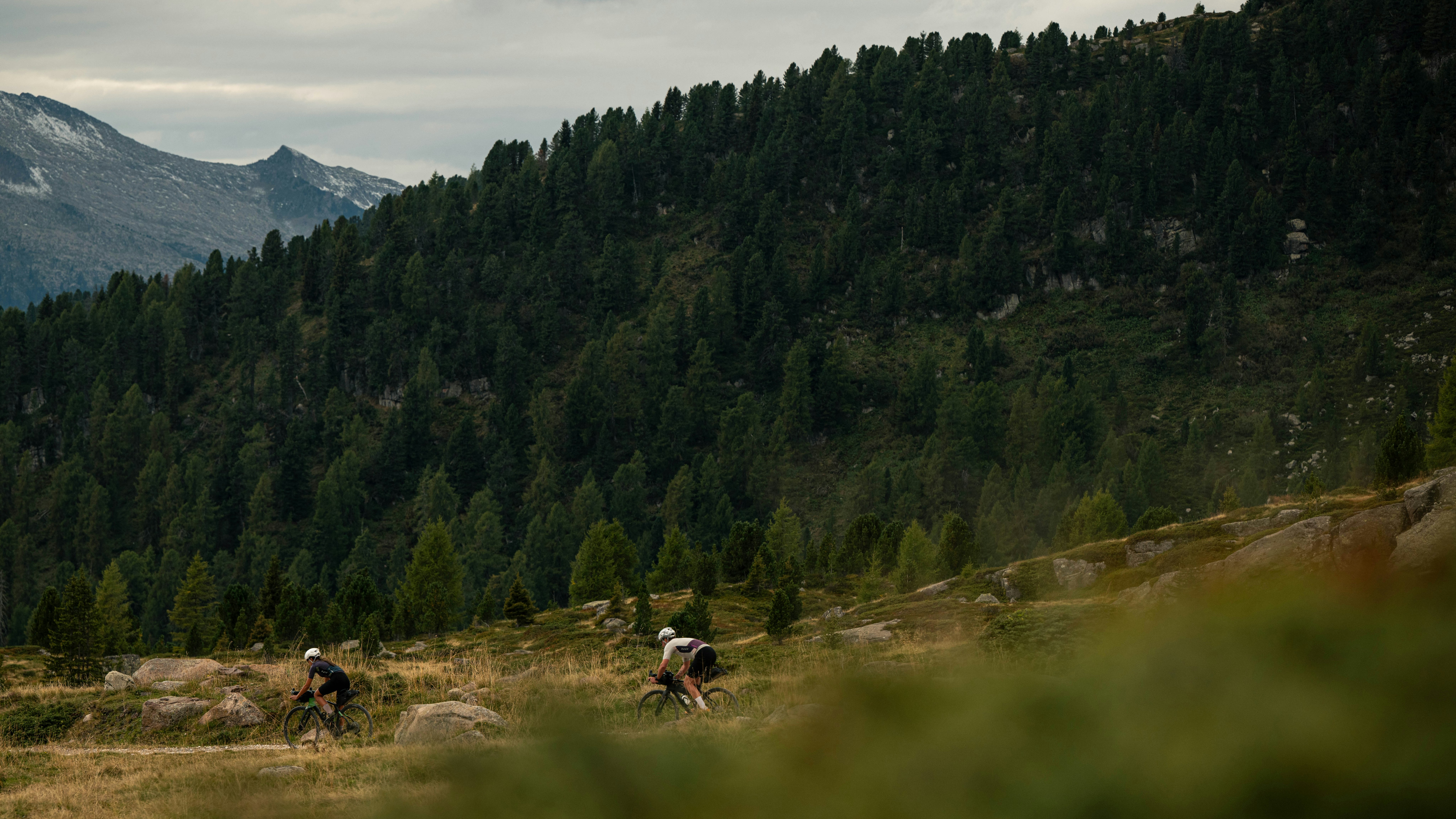 The gradient of the gravel road is steady, and we proceed at a good pace. We soon emerge from the woods and get to Mont Sëura. What a place and what a view! It’s hard not to stop every meter to admire it. The Sassolungo towers over us in all its majesty. We feel so small next to its walls. From here on, we enjoy a good portion of the descent. Raja drops down the slope at an incredible speed and barely manages to negotiate the last turns. It's so funny that we can’t stop laughing. The last steep climb though reminds us that it is not all fun and games. It starts to get dark, the wind is blowing, and the temperature dropping; it’s time to hurry up.