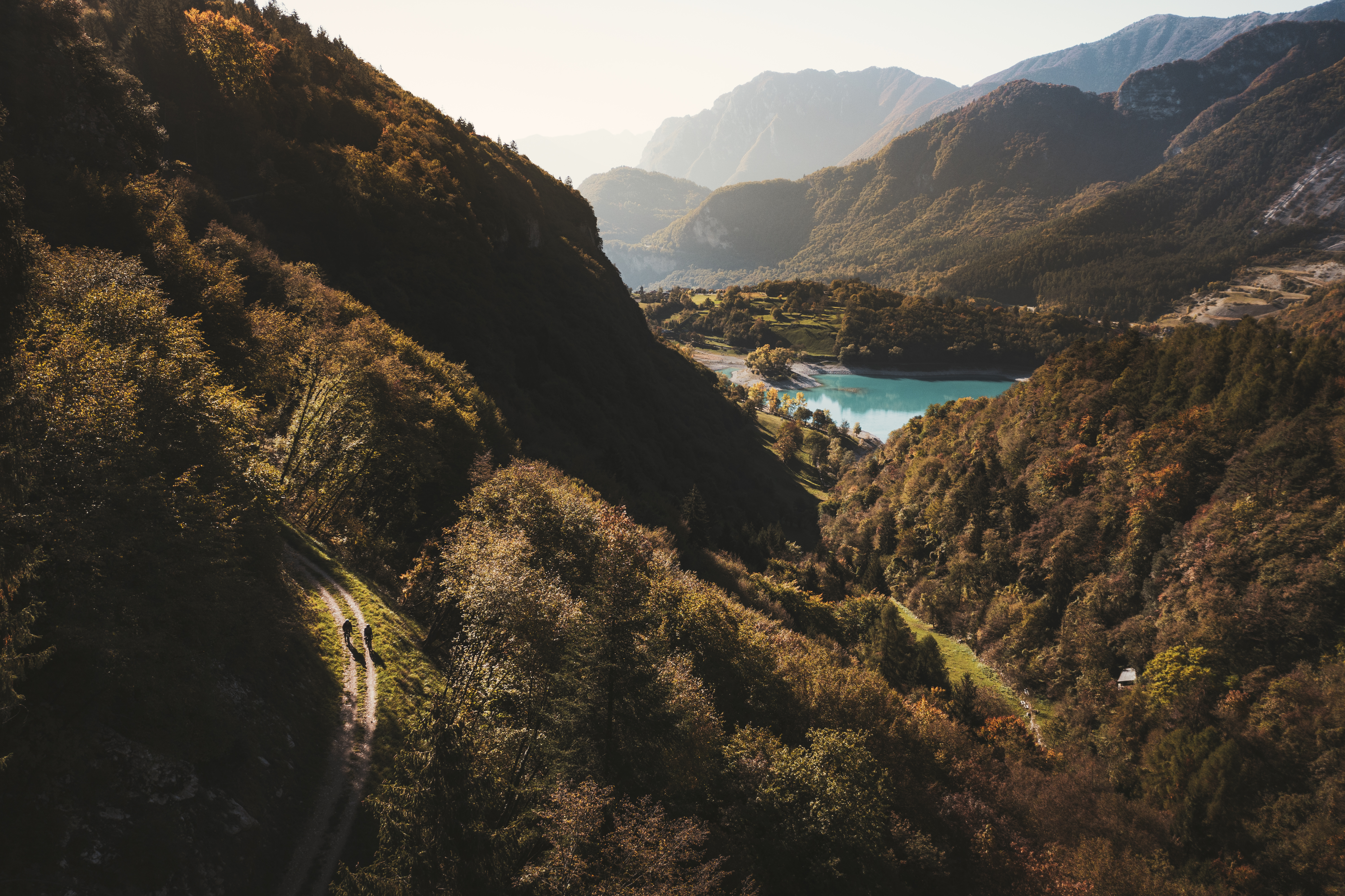 It is done and it is only 2:30 p.m. So we decide that we have not had enough and we set ourselves another goal for the evening. We still have three hours of daylight, a breathtaking descent to Preore and then another gentle climb through Ponte Arche, Comano Terme, Fiavè and finally up to the Ballino pass. It doesn’t seem real, the dirt road that reaches the emerald Lake Tenno is something incredible, a continuous dance of light, one bend after another.
