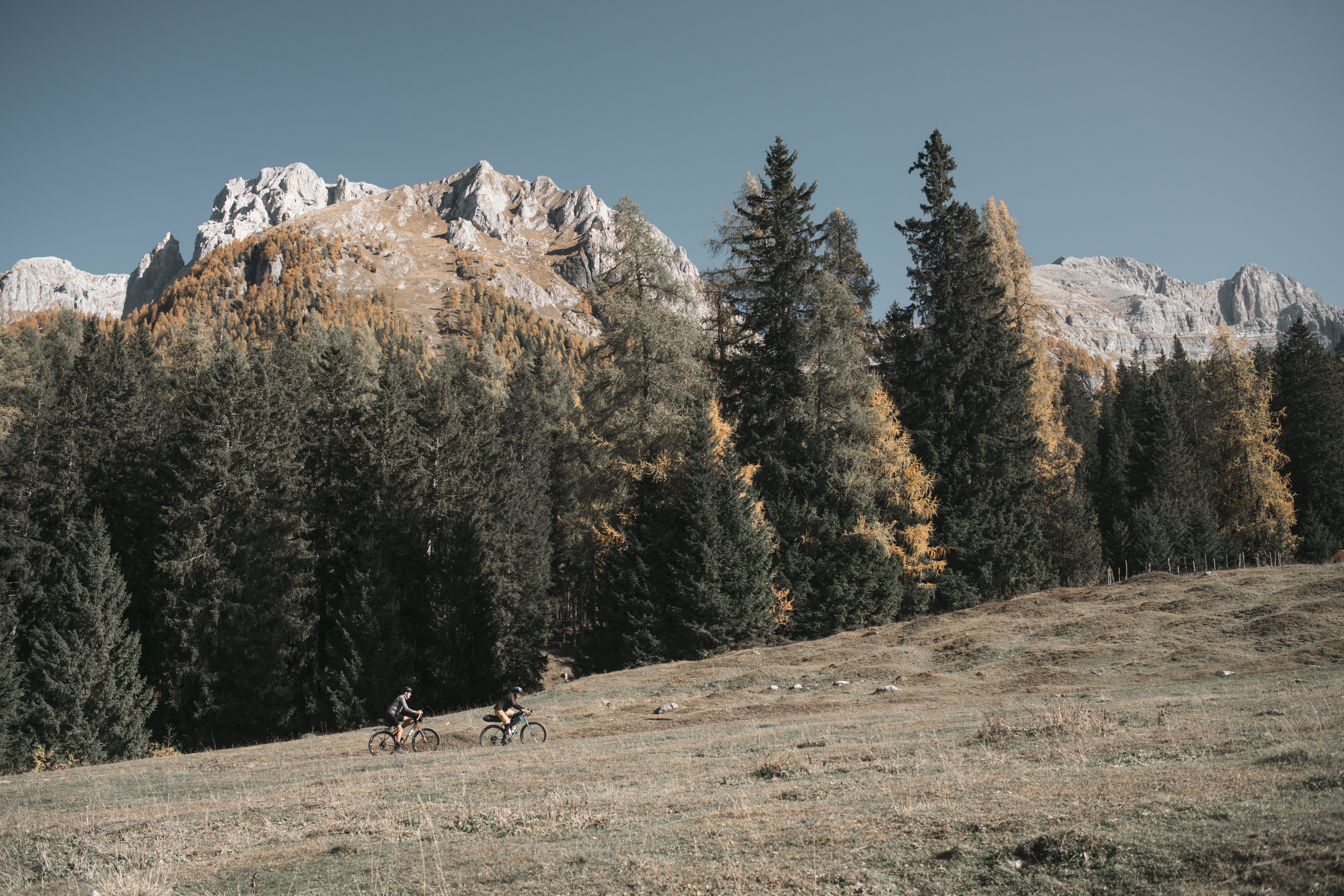 The road to Folgarida and Campo Carlo Magno is a silent snake winding its way through wonderful meadows and mighty larches. I watch this valley flow by from my pedalling perspective: I will have enjoyed it hundreds of times, but I will never tire of such beauty. We climb, slowly but steadily: the breath is there and the team spirit too. Chatting about this and that, we wonder what we should do in case we spot a bear on the road. Here, just like in British Columbia - remember the premise from which we started from? - it would not be at all uncommon to have a close encounter with the plantigrade... But fortunately, all is quiet on the horizon. We enjoy the most beautiful stretch of unpaved road on our journey.
