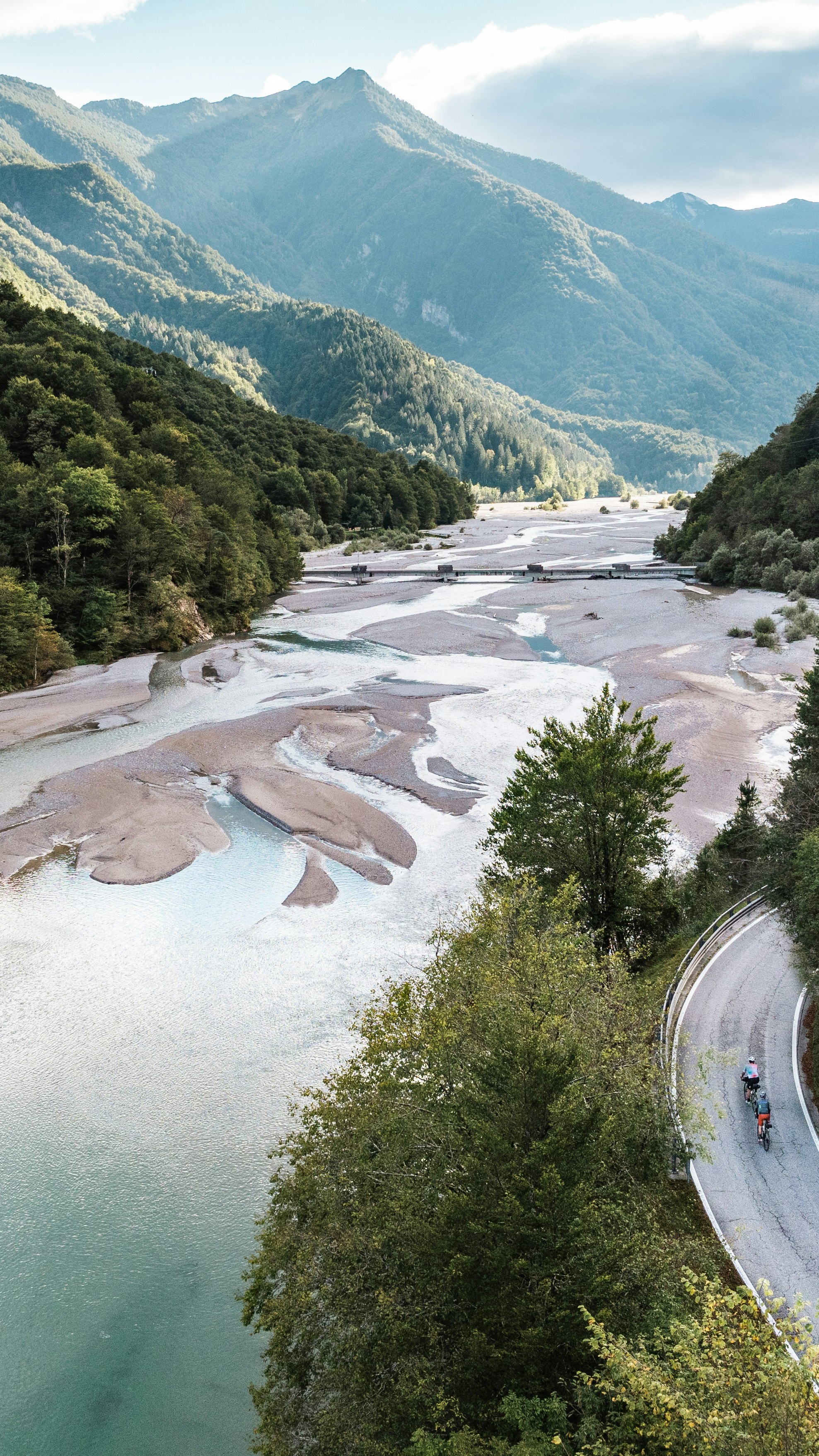 We cross the long gravel slip of the Tagliamento near Peonis, the hamlet of Trasaghis where in 1927 Ottavio Bottecchia, the hungry, sharp-nosed cycling hero was found close to death. Just a hundred years ago he had become something of a god in France by winning the Tour, the first Italian in history.