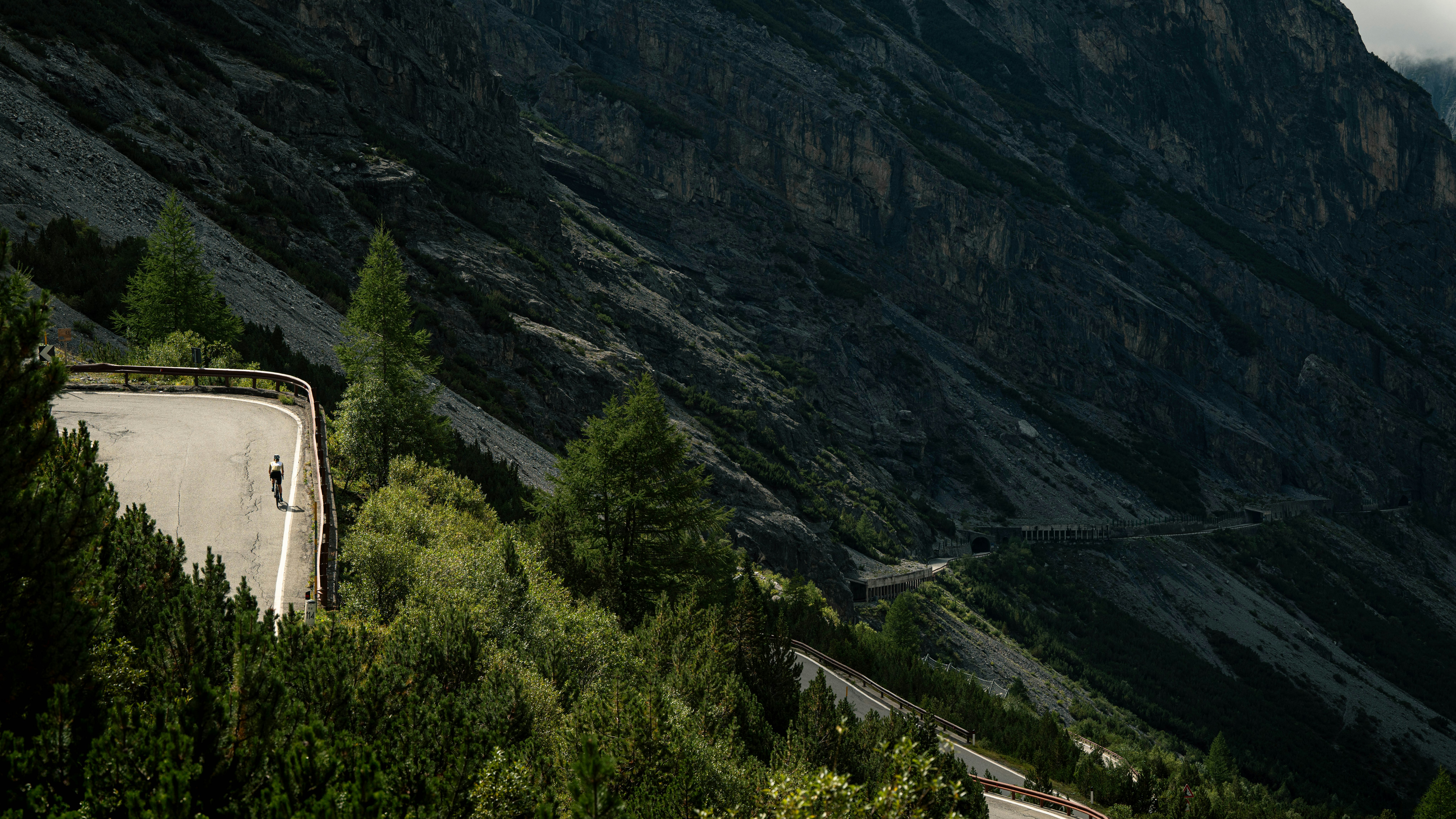 We follow the Gurglweg river, ride through a couple of villages, and then climb into the woods before finding ourselves out in the open. The turns seem even more impressive from down there. With the Alpengasthof Tibet Hütte restaurant in the background, it feels like being on the moon where the asphalt has been laid down in a futuristic past. Just after the pass, we take an alternative route and decide to ride the old road, abandoned because very exposed to avalanches during winter. We watch out for rocks but still take our time to enjoy the view. From there, we overlook the Umbrail Pass, to which we are heading now.