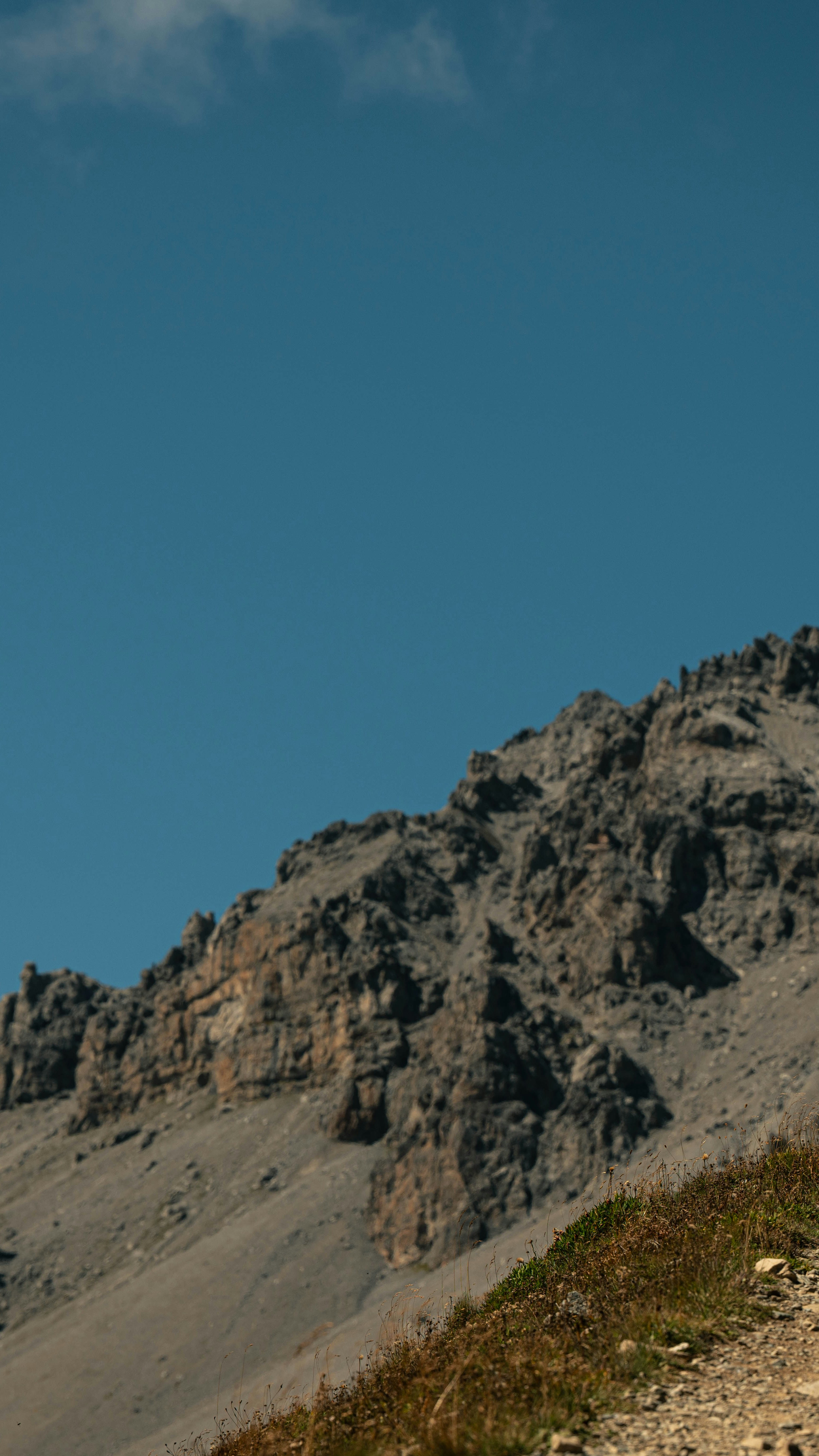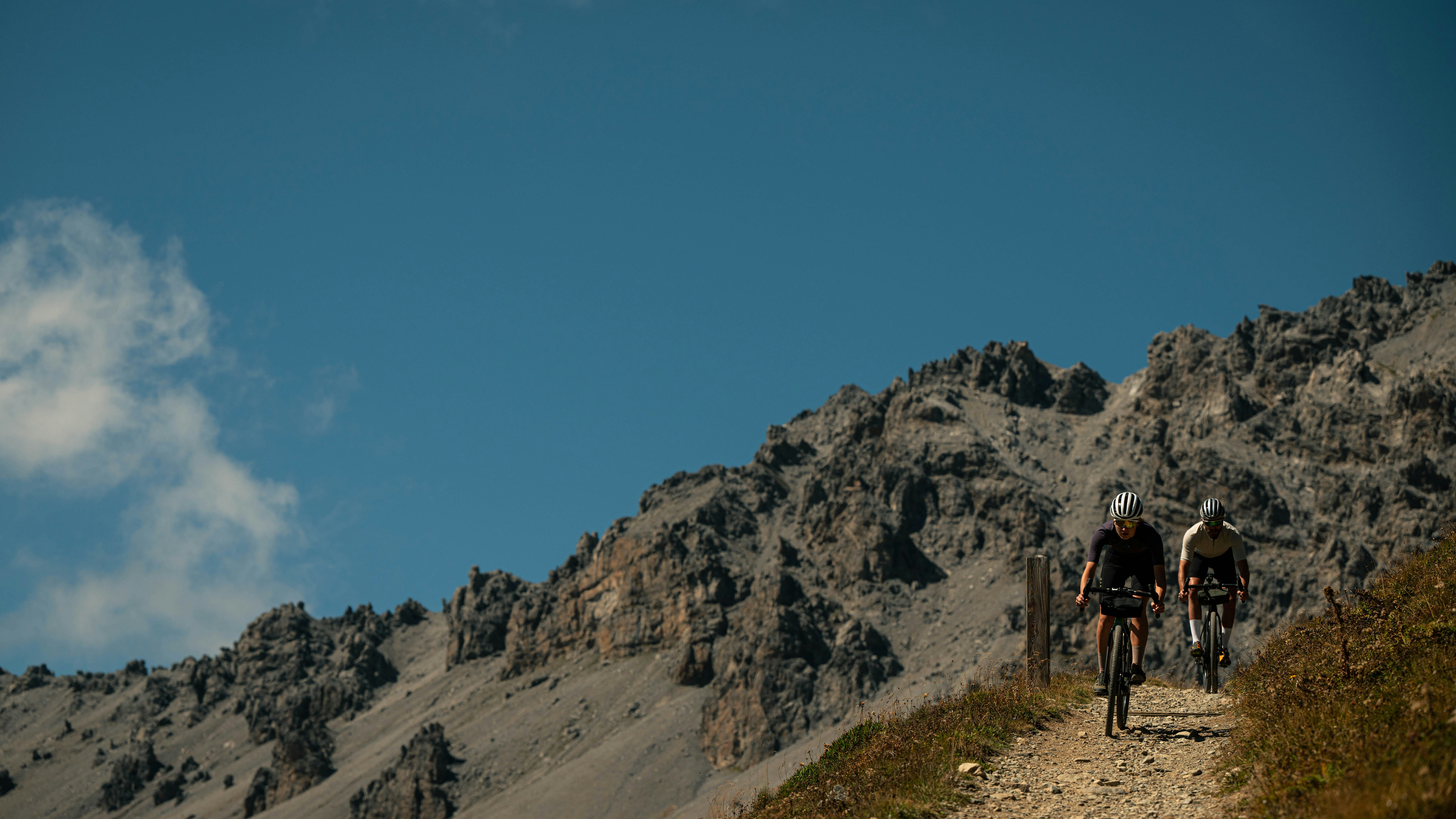 The trail becomes gradually more technical, but also quite impressive: it looks like a small gravel ribbon, sometimes hanging on the side of the mountain, others winding over the alpine pastures and occasionally supported by partially collapsed stone walls. A lunar landscape slowly surrounds us as we reach 2700m of elevation. In front of us, we can spot an old military barrack from World War One. That’s where we are heading and this will turn out to be the most challenging part of the trip. Steep, loose dirt, loose rocks, solid rocks, rocks, rocks, rocks. We will have to push our bikes, but luckily not for too long.