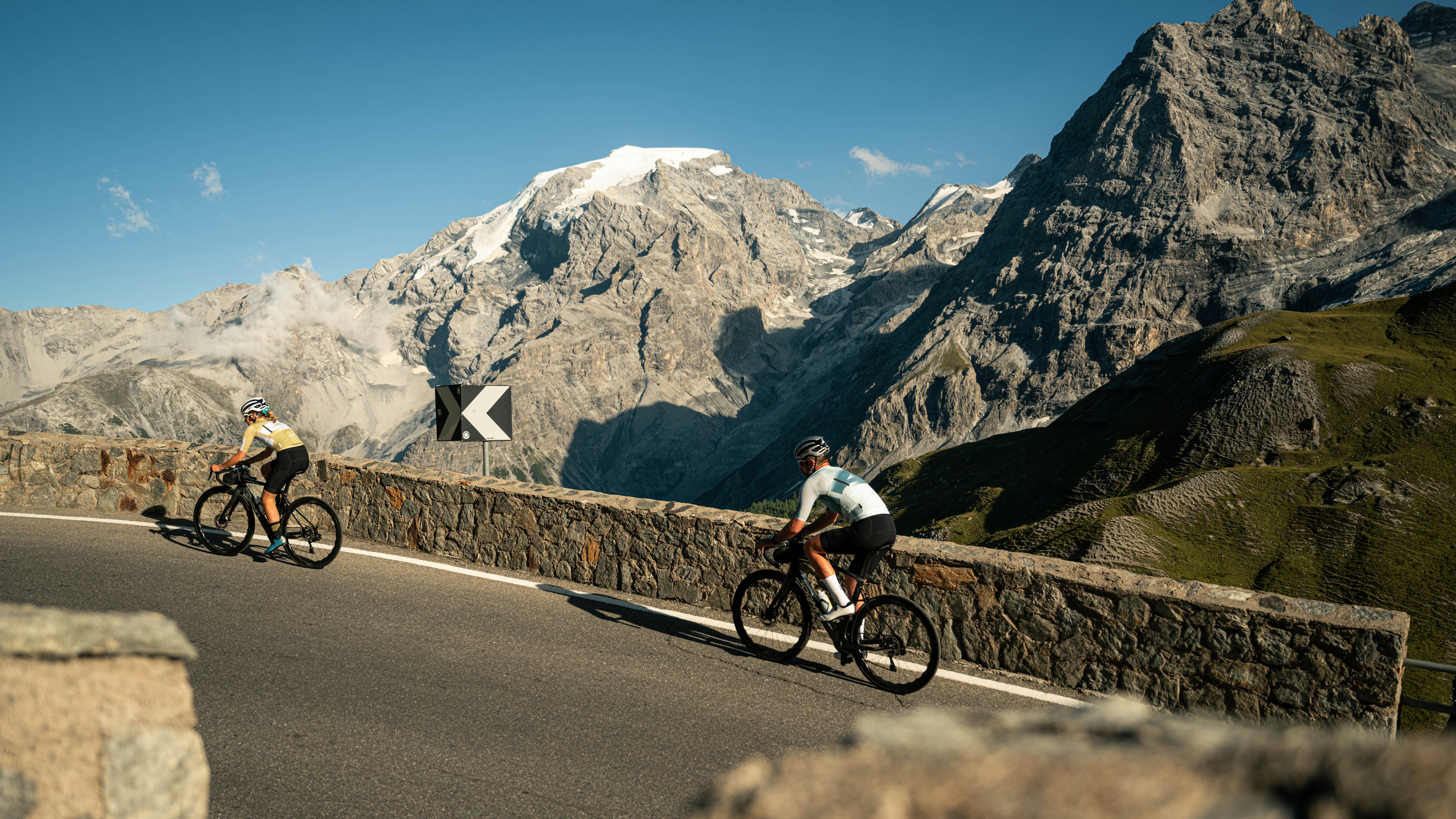 As you’ll probably have guessed already, using all the roads at our disposal to climb is the best way to pay tribute to this icon. When you start adding up the numbers, it turns out to be a hell of a challenge: 4.750m of elevation gain and 124 km on tarmac, 2.130m of elevation gain and 30 km on gravel. A start at 1.225m, a mountain pass at 2.758m, the highest mountain road pass of all Italy, the highest mountain road pass in Switzerland and a total of 123 hairpin turns on asphalt for the climb only (just double the numbers for the full loop). Our heads are still spinning!