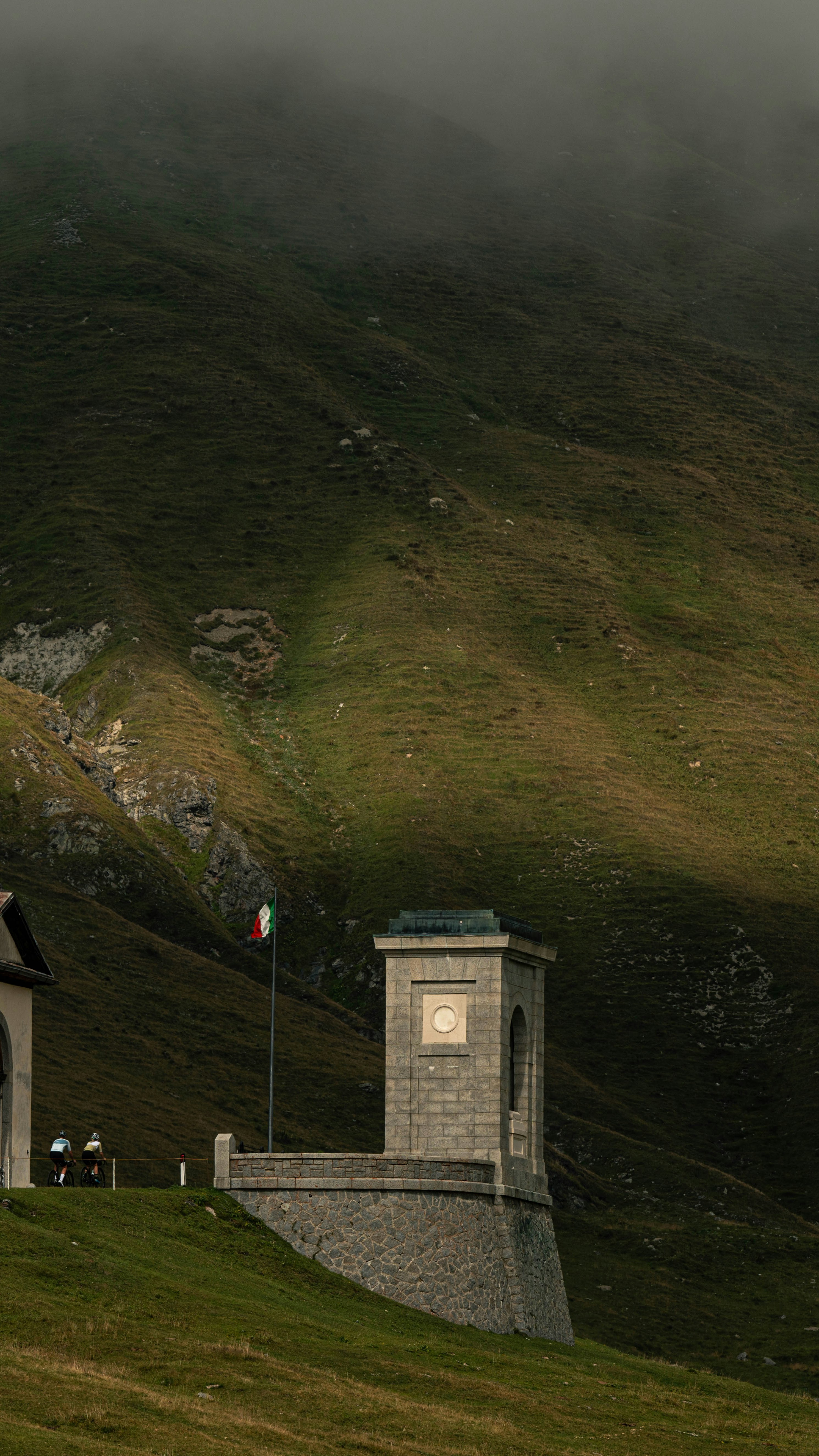 We notice the most obvious things: no asphalt, fewer trees and no bar. We were told that the restaurant was created by a smuggler back then. The Stelvio Road was created first and foremost to connect places. In 1859 it turned into an essencial linking point between countries when it became an international borderline between Italy, Switzerland and Austria. After the easiest part of the climb, we pass by the war memorial and cover the last four turns that take us to one of the most famous places of the Stelvio: the road worker's house number IV and the intersection with the Umrbail Pass. Watching the old pictures, it looks like the line between past and present is blurred. Take some pencils to colour it in black and white, remove the carriage and add the bike: here we are, 150 years later.