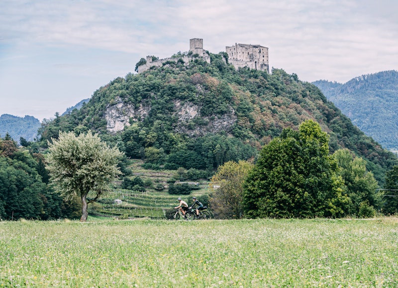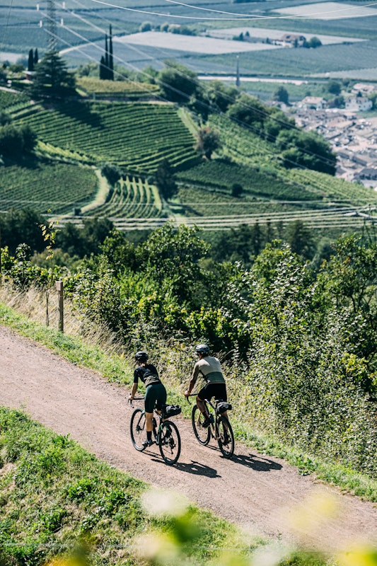 Little by little the buildings give way to cultivated fields and after a few kilometres we find ourselves on the Strada del Vino (Südtiroler Weinstraße: a spectacular route of around 70 kilometres that touches on sixteen municipalities. We ride through vineyards, wine cellars and absolute peace and quiet. The road then turns right and, slightly downhill, we get to the lago di Caldarno. Every now and then other cyclists slow down and try to fully immerse themselves in the landscape. We reach Termeno, a very picturesque village and well known to wine lovers because its German toponym, Tramin, indicates the production area of Gewürztraminer, a very fragrant white wine. Having passed Cortina on the Weinstraße and Salorno, we keep cycling, alternating between light conversation and silence. We let ourselves be lulled by these roads and the wonders we encounter as we go along. We come into contact with the rhythms of village life, beautiful landscapes and roads that seem to have been created to greet cycling enthusiasts. The last stop of the day is Egna. We become lost in low porticoes, hidden alleys and wonderful sceneries. We decide to stop here for the night. Our eyes are full and our legs tired, and this is the ideal place from where to tackle tomorrow’s stage.
