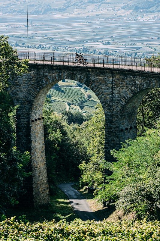 Today’s route involves cycling along what the people of Trento call the Vecia Ferovia, considered as one of the most spectacular cycle paths in Trentino Alto Adige. The railway was built in the early 20th century by the Austro-Hungarian army. From the 1960s onwards, with the development of road transport, the route was decommissioned and today this railway has been transformed into an amazing cycle path, mostly unpaved, connecting Ora, in the Adige Valley, with Cavalese, in the Val di Fiemme. Shortly after the start, we leave the town and, almost without realising it, begin what will be an almost 30-kilometre climb, but with very manageable gradients. Slowly the vineyards give way to orchards. We say goodbye to South Tyrol and head towards Trentino.