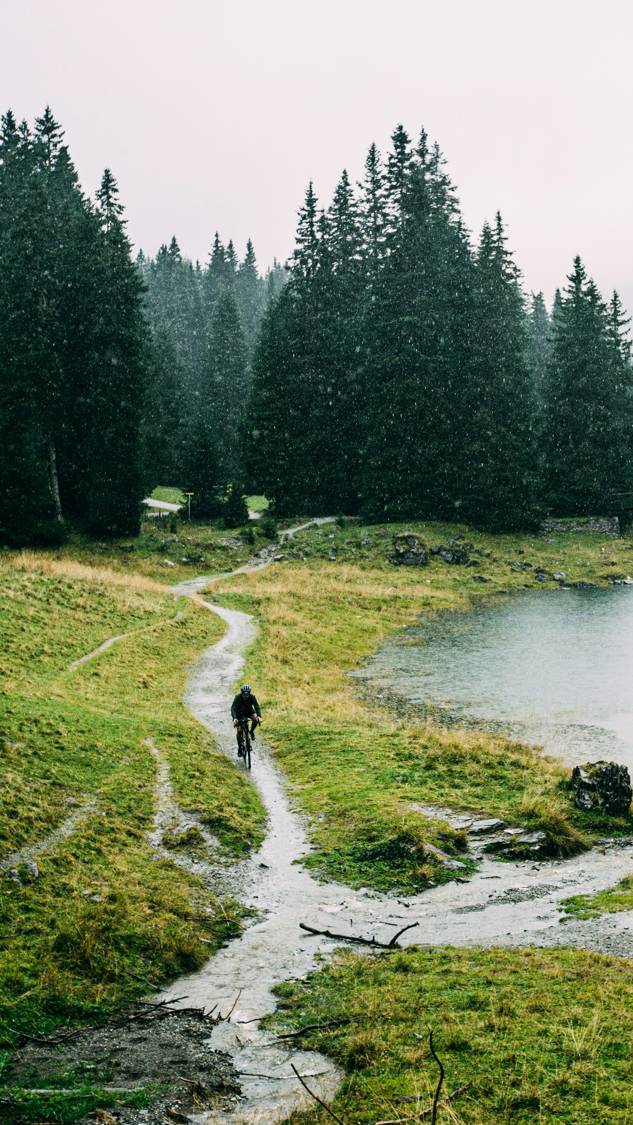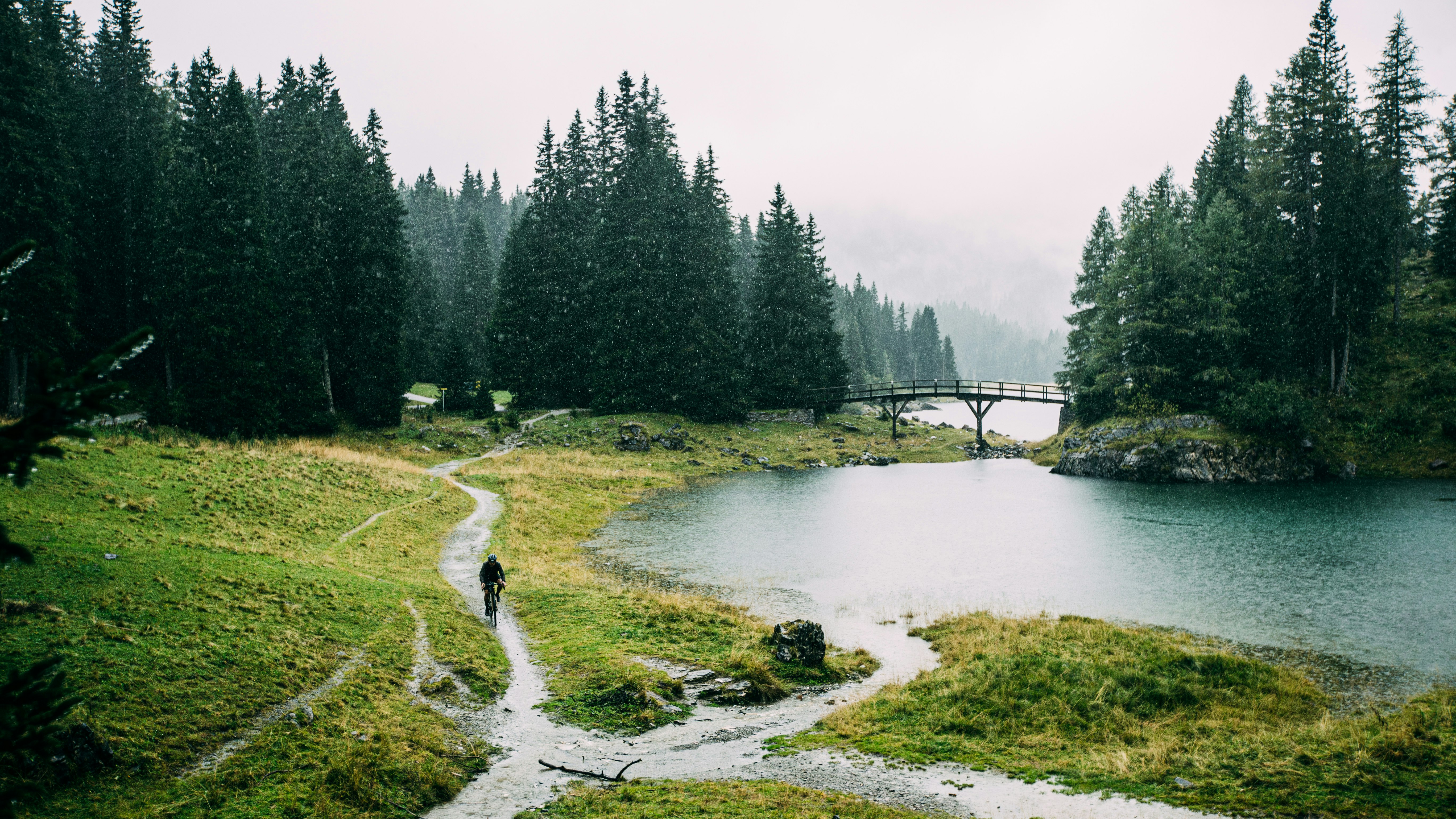 We stop for a moment and catch our breath: we can’t make our mind up on whether to go straight ahead and find a place to stop or to follow the original plan and take the turn towards the lake. In the end we choose for the second option: we turn right, reach the car park and turn onto a dirt road which, one metre at time, climbs up through a forest. The stones are slippery, the wet gravel doesn’t help and forces us to climb more by force than agility. A little over two kilometres and we come to the top: we look at each other, dry ourselves off as much as possible and agree on one thing: it was definitely worth it. A fairytale vista opens up, with centuries-old trees, the lake dominating the valley, the incredible scent of nature. We ride for a while, cross a very slippery wooden bridge that takes us to the opposite bank of the river and then, feeling very cold but pleased with the choice, we take the road back.