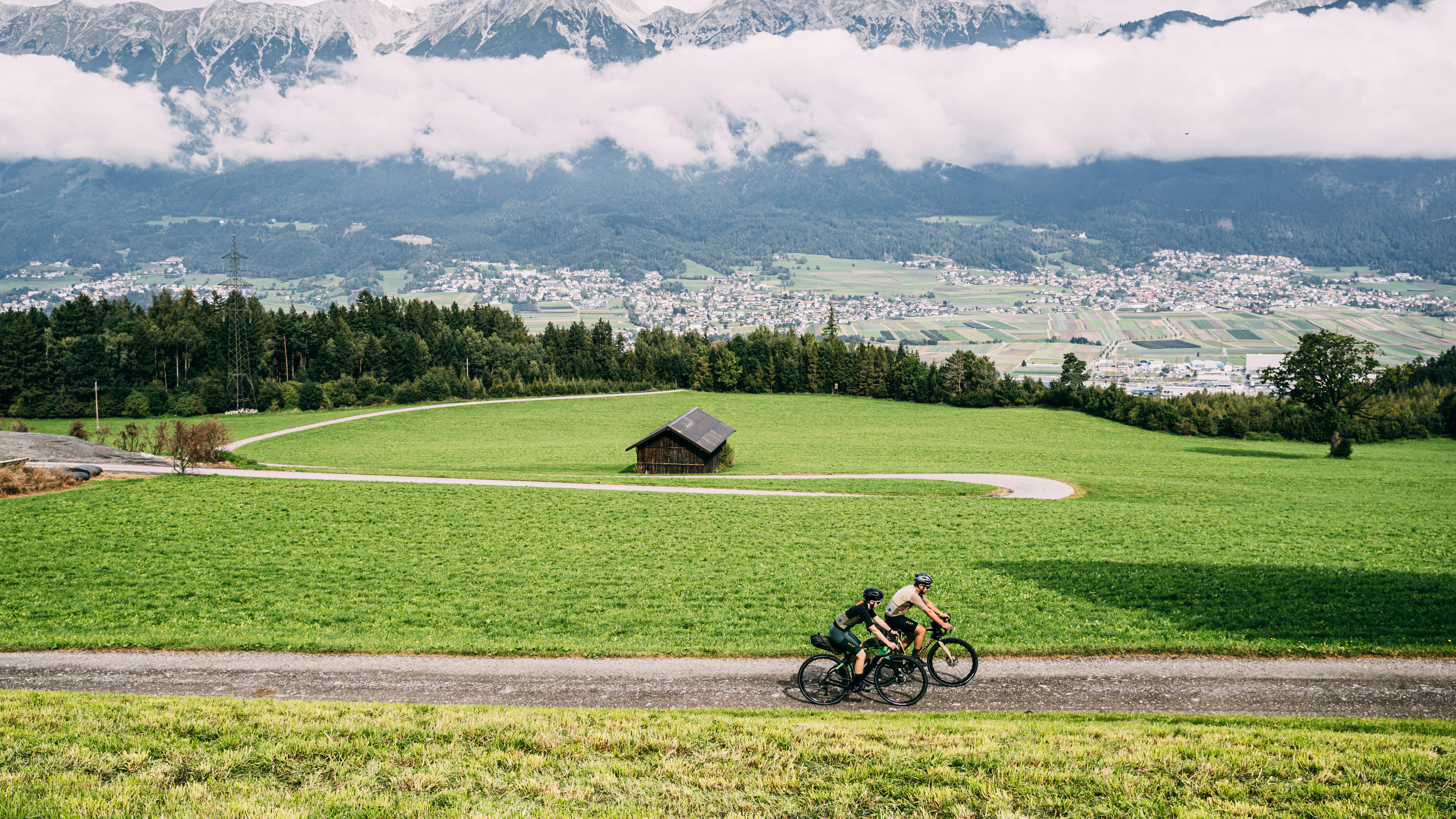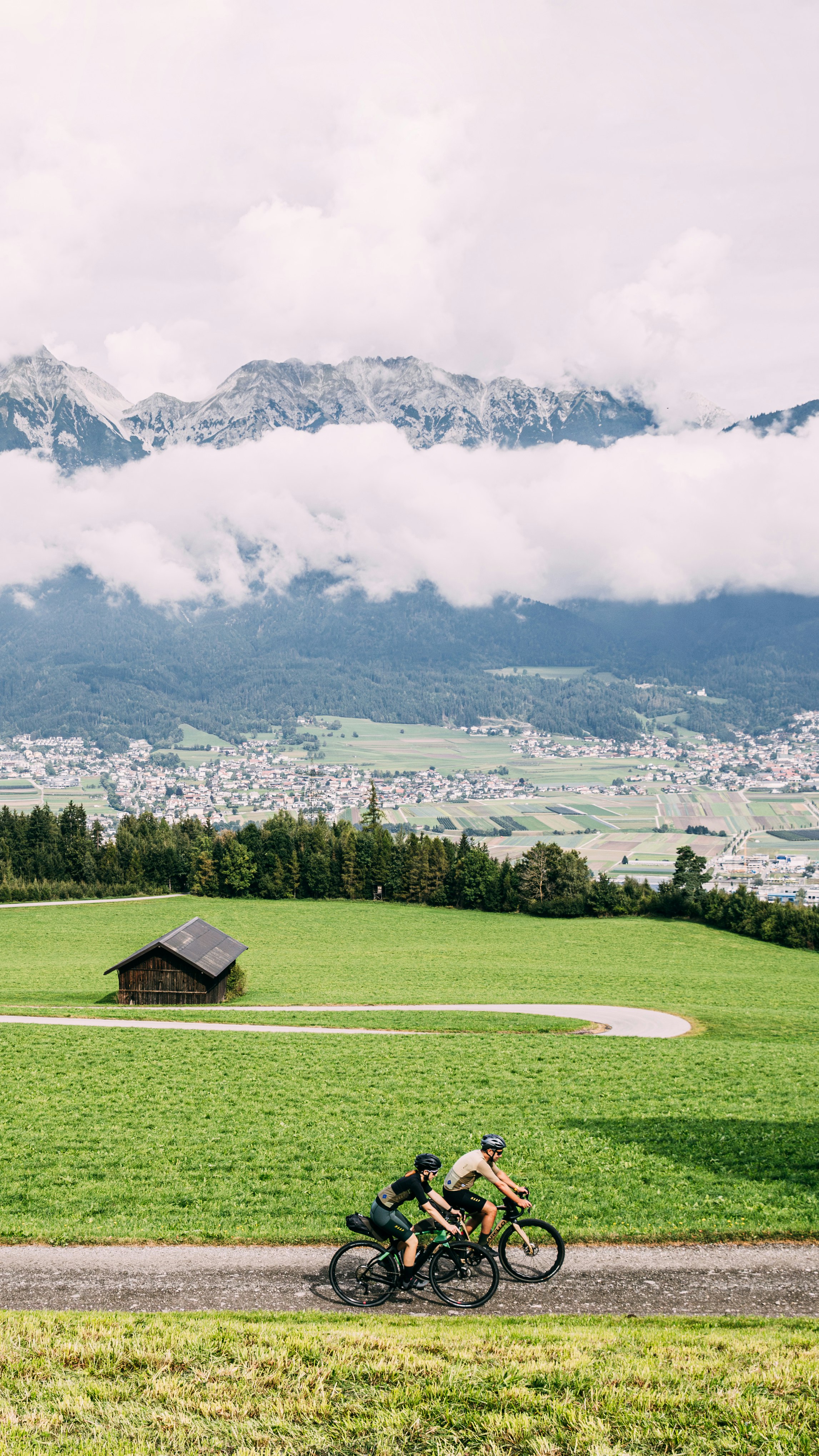 Let’s cut the nonsense. We set off. The first few rides help us get used to the rain. To warm our legs up and figure out the correct direction. We set off towards the centre of Schwaz and stop only after a few hundred metres: the imposing Gothic church of Maria Himmelfahrt, which means Santa Maria dell’Assunzione, catches our eye. We take a quick peek inside and then set off again towards the hight street. We cycle for about fifteen kilometres, quietly for the most part, so as not to disturb a town that is slowly waking up. Trying not to think about the cold, we often find ourselves looking up: typical houses, bakeries, some bicycles here and there. After a few kilometres, the country gives way to cultivated fields. Little by little, the sky clears, the rain stops, and on the horizon, we start to see the huge mountains that surround us.