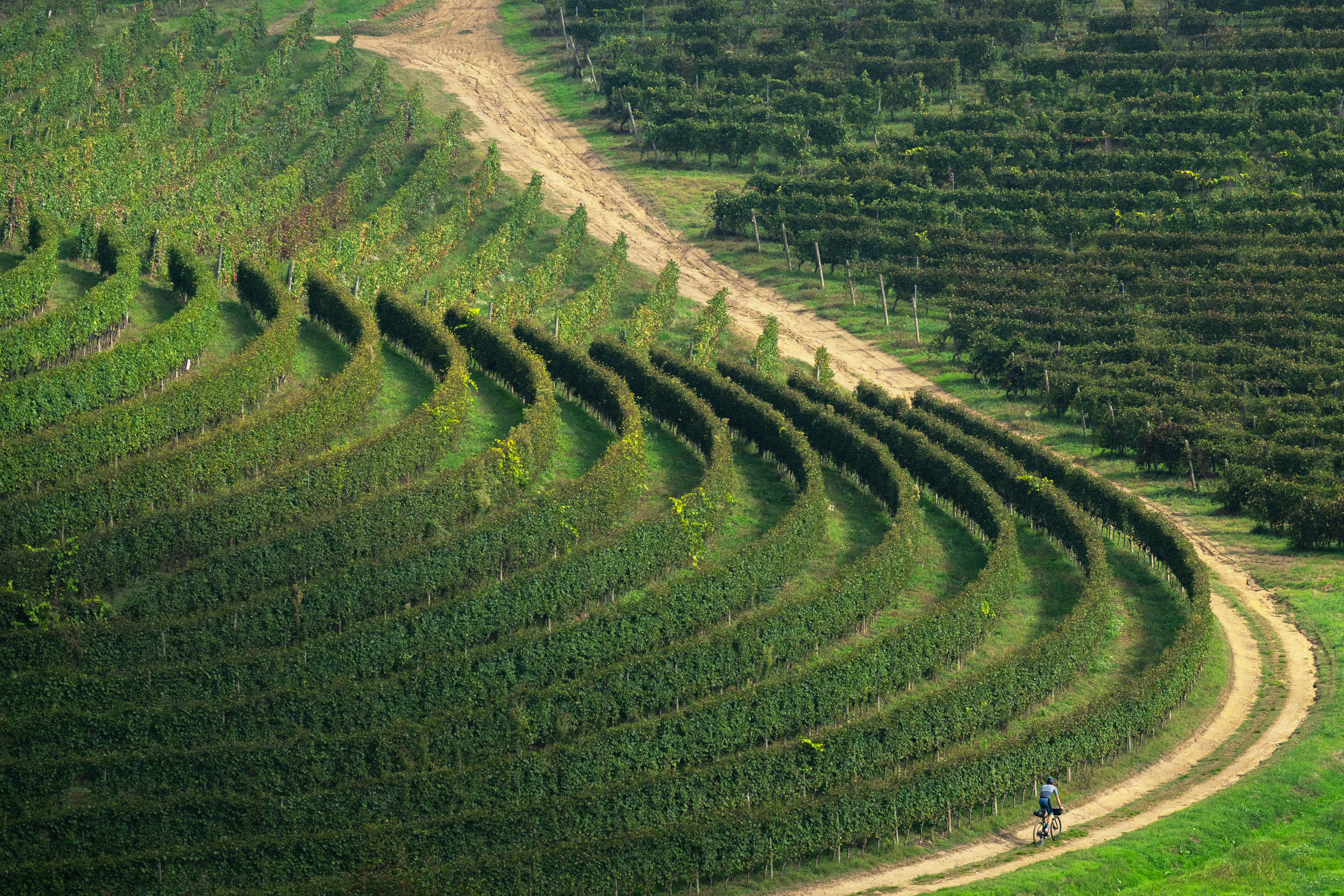 La campagna tra l’altopiano delle Vaude e le colline ci avvicina rapidamente agli splendidi vigneti dell’Erbaluce, nel pieno del grandioso Anfiteatro Morenico di Ivrea: uno degli spot migliori per scorrazzare su infinite strade sterrate, tra torrenti e laghi lasciati in regalo dal grande Ghiacciaio Balteo, che fino a 10.000 anni fa arrivava proprio qua, scendendo dalla Valle d’Aosta, regalandoci anche la collina morenica della Serra, perfettamente rettilinea e che rende riconoscibile in modo unico il paesaggio della pianura tra Biellese e Torinese.
