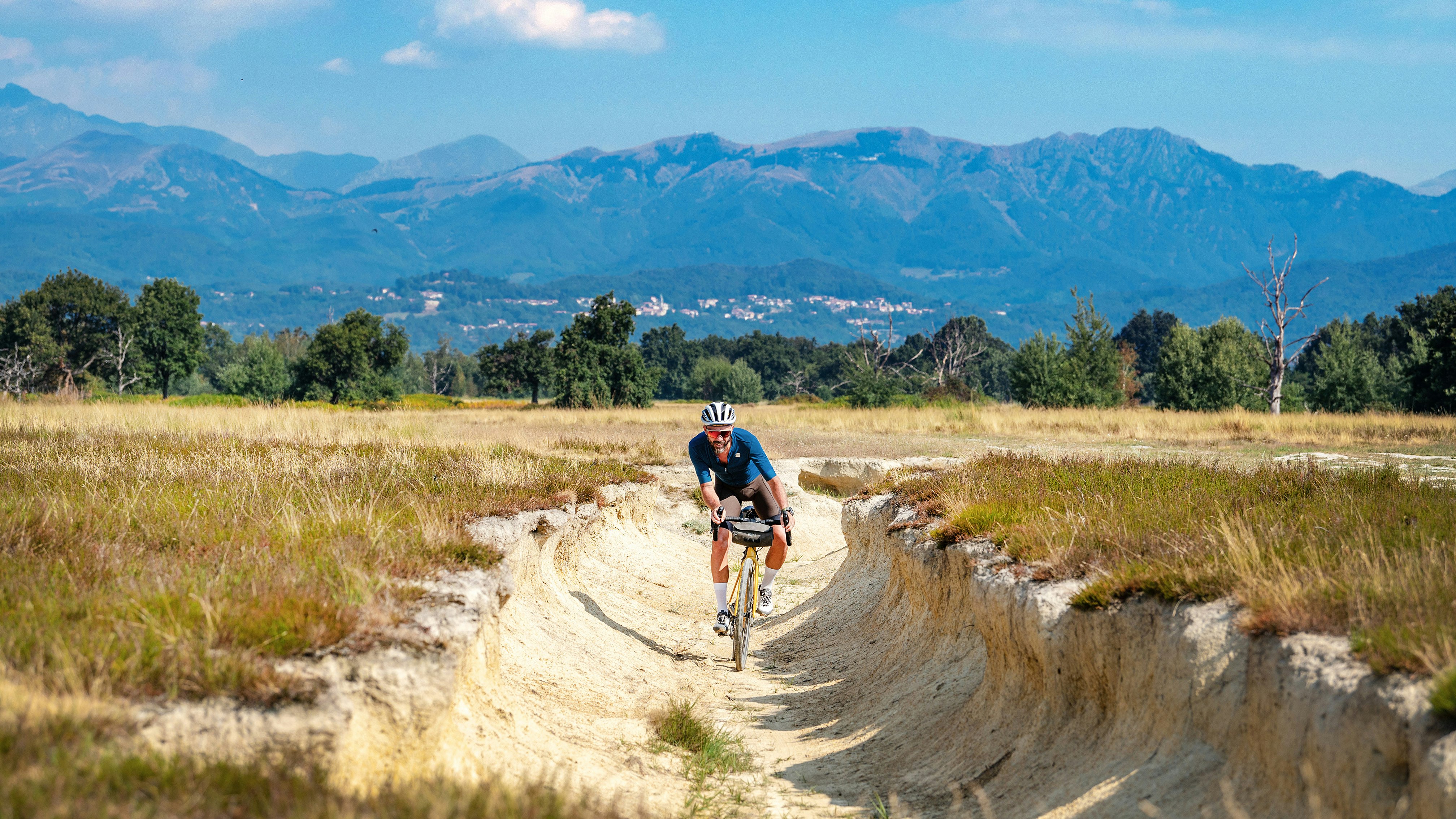 Pochi tornanti e si entra in un altro ambiente strepitoso, quello del grande terrazzo fluviale della Baraggia. È un esteso altipiano di terreno argilloso, sospeso tra i torrenti Cervo ed Elvo, completamente disabitato e caratterizzato da ampie radure prative spesso coperte di erica e radi boschi di betulle e querce. Fino a non molti anni fa, la parte meridionale era inaccessibile e riservata a esercitazioni militari, ma oggi le giornate di chiusura sono limitate e pochi giorni all’anno. Lo percorriamo per 18 chilometri quasi completamente pianeggianti, su strade sterrate e single track che, da soli, valgono l’intero viaggio, con orizzonti apertissimi e scorci magnifici sulla montagna. Anche qui, attenti al fango e alle pozzanghere, ma ci potete venire in tutte le stagioni dell’anno, anche nelle giornate più fredde dell’inverno. Noi ci arriviamo quando le ombre del pomeriggio si allungano sul terrazzo sospeso a quasi 100 metri sopra al greto del torrente Cervo, vicino ad una grande quercia: ci fermiamo un attimo e con soddisfazione ammiriamo la strada fatta, il grande arco che abbraccia tutto il Biellese orientale.