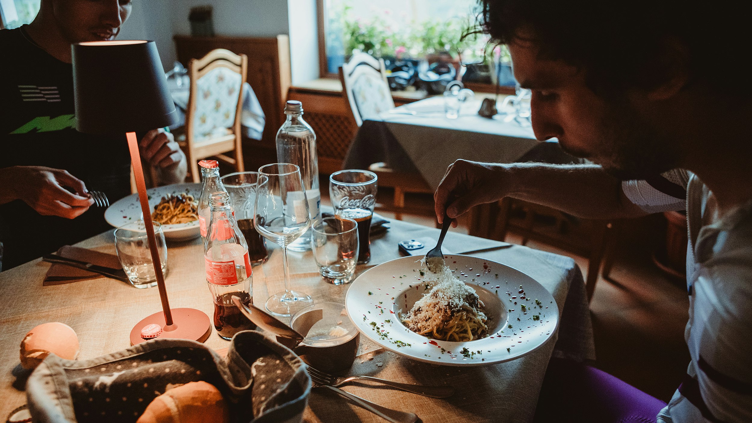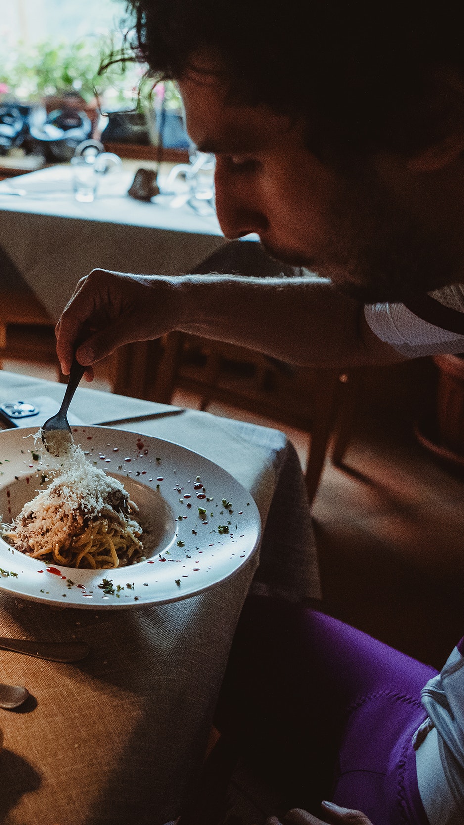 Ora guardiamo la catena del Latemar da Nord-Ovest e, forse in preda a un attacco di follia pre-prandiale, decidiamo di oltrepassare il rio Nova Levante e affrontare un muro insensato verso la frazione di Laner. Un chilometro e mezzo al 12% è ciò che dice l’altimetria, il Mortirolo preso da Mazzo è ciò che avvertono le gambe. Finalmente a Nova Levante abbiamo tempo di sederci a un tavolo e far tornare ossigeno al cervello, anche grazie a un generoso piatto di pasta.
