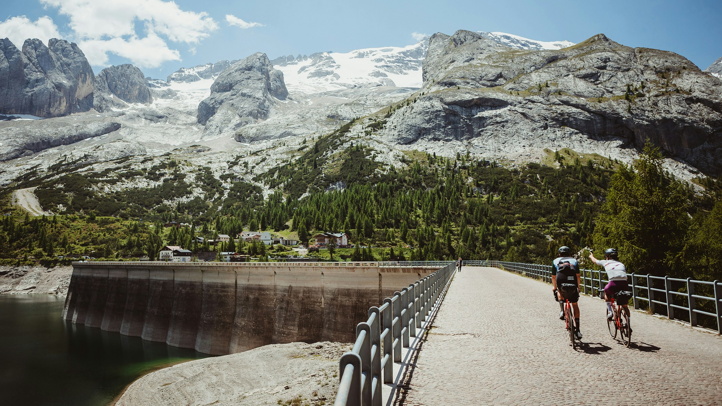 Quello che va su da Canazei è il versante più facile. Per noi però, carichi come siamo di borse e di cibo, è più duro del previsto. Salendo, dopo quattro tornanti, percorriamo una sequenza di gallerie, tutte aperte e illuminate in modo naturale, tranne l’ultimissima. All’uscita di questa compare la diga del lago Fedaia. Come molti altri ciclisti arrivati al cartello del passo, percorriamo il ciottolato che copre la strada sulla diga per goderci quel fantastico punto panoramico. Secondo me, i due chilometri piani da percorrere lungo il lago sono con ogni probabilità i più bei due chilometri piani d’Italia: oltre quota 2.000 metri, con le Dolomiti e prati verdi tutto attorno... A pedalare, le gambe non le senti nemmeno.