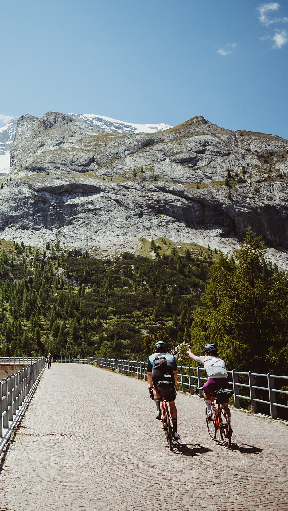 Dal momento che i Serrai di Sottoguda sono ancora chiusi – i lavori per sanare i danni provocati dalla tempesta Vaia del 2018 dovrebbero terminare entro l’estate del 2024 – intraprendiamo, in discesa, la strada che in senso contrario ha deciso il Giro d’Italia del 2023 (vedi box). Le scritte sull’asfalto ancora ben visibili, le rampe finali al 15%, il rettilineo di Capanna Bill che infiliamo agli 80 km/h: la Marmolada da Malga Ciapela, minacciosamente detto il Cimitero dei campioni, è una salita leggendaria. La sta facendo un vecchio amico, Daniele, che incontro per caso e ho la malaugurata idea di abbracciare, sudato com’è per lo sforzo: non è stata una bella esperienza…