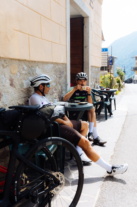 La giornata è splendida: più fresca di ieri, ma con un cielo terso e blu zaffiro, di quelli da quadro rinascimentale. Colazione abbondante: uova e formaggio della Valcamonica, borracce generosamente rabboccate, una con sali e l’altra con acqua. Controlliamo che il nostro bikepacking sia ben agganciato sotto la sella e sul manubrio e iniziamo a pedalare.
