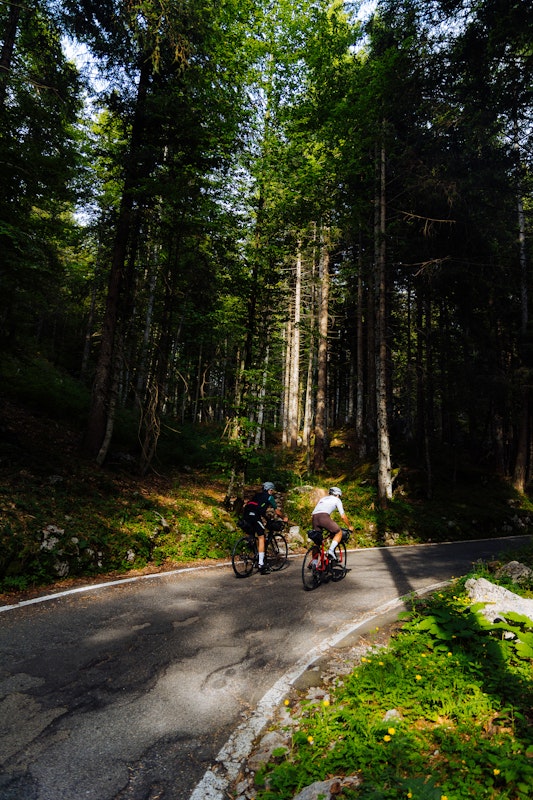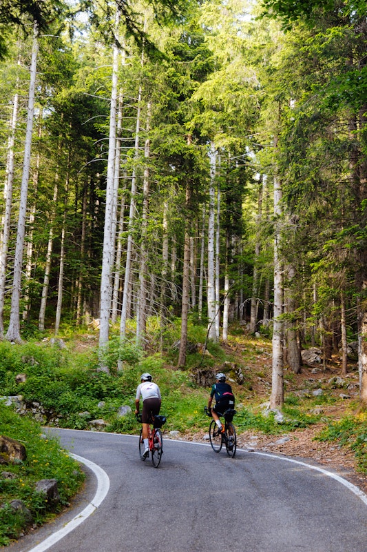 Da Schilpario parte anche, alla nostra destra, la seconda – e ben più dura – ascesa che ci condurrà al Passo del Vivione (1.828 m). I primi 17 chilometri sono vallonati per poi diventare, una volta entrati nel bosco di pini e silenzi, tortuosi e quasi mistici: una sorta di ciclistico Into the wild. Li percorriamo con una lama sottile di sole che filtra a fatica tra i tronchi e i rami, il che aggiunge ulteriore magia alla magia.