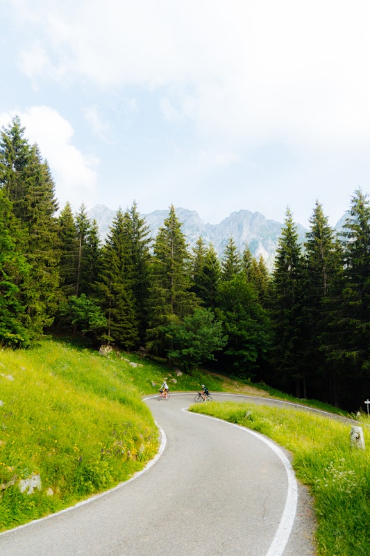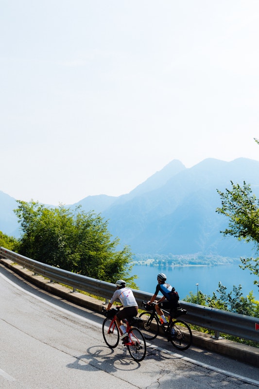 La sensazione, fortissima, non è di stare pedalando, ma di essere letteralmente preda di un incantesimo. Le pendenze crescono a mano a mano che saliamo. Poi un tornante a sinistra, uno a destra ed eccole: le Dolomiti di Scalve che si aprono in tutto il loro splendore, e ai loro piedi un piccolo laghetto in cui si specchia il cielo blu.
