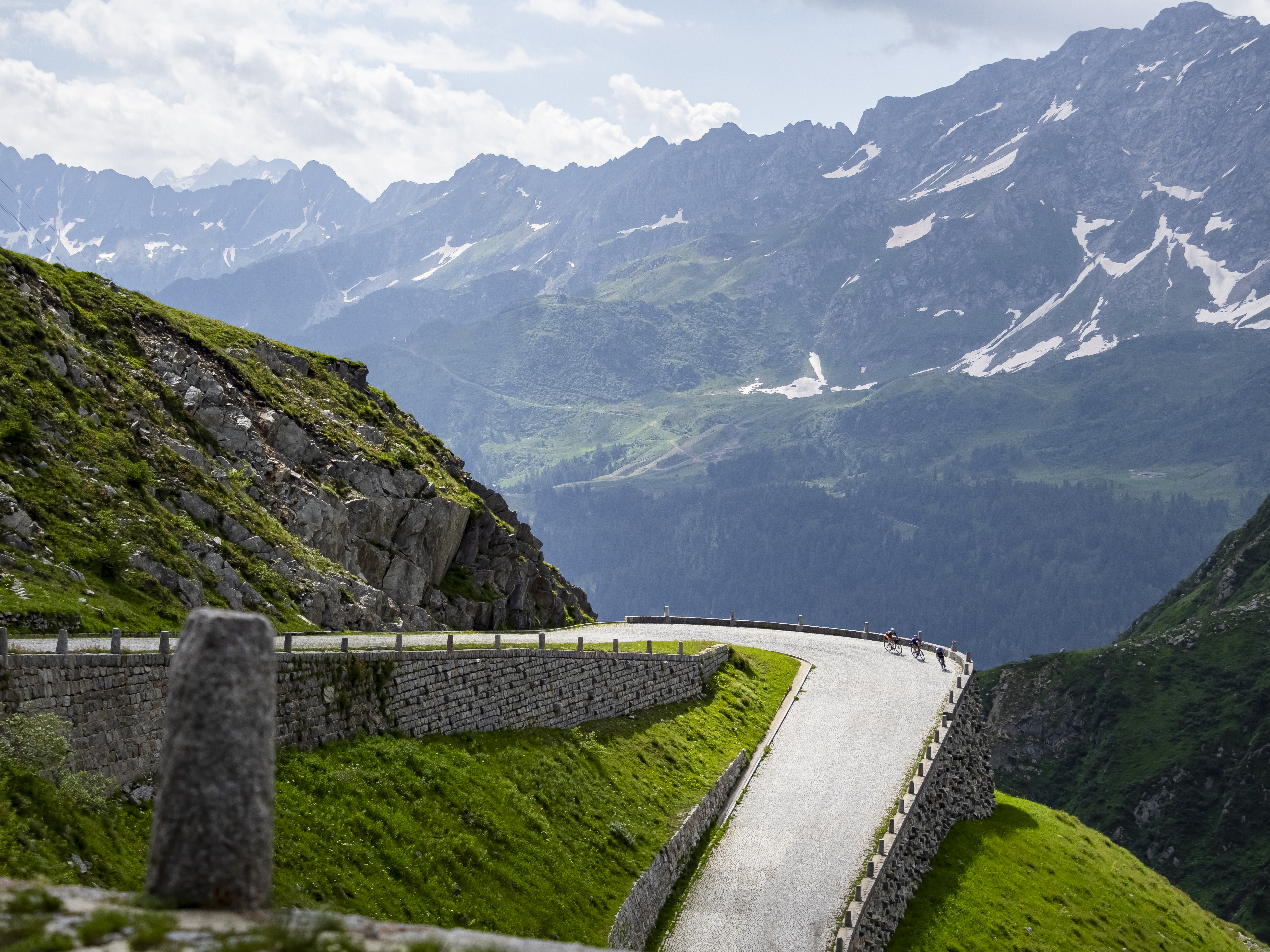 Alle 7 del mattino siamo già sul pezzo. L’aria è frizzante, così vestiamo lo smanicato appena usciti dall’albergo. Ma poi, come sempre, non ce n’è bisogno, perché la strada si impenna subito e si inizia a sudare; una serie di drittoni ci consegna il Passo del Lucomagno, con i suoi 1.900 metri di quota. Ora sì che serve coprirsi, prima di iniziare la picchiata verso il Cantone dei Grigioni, risalire verso il Passo dell’Oberalp, e arrivare nel centro sciistico di Andermatt nel Canton Uri. Ci aspetta il punto più affascinante e sicuramente più atteso del secondo giorno. C’è da affrontare la salita del San Gottardo che ci riporterà nel Cantone Ticino. Abbiamo da percorre quasi dodici chilometri fino ai 2.100 metri del Passo. I tornanti si snodano su due Cantoni: partiamo da Uri per poi arrivare, già dalla seconda metà della salita, in Ticino.