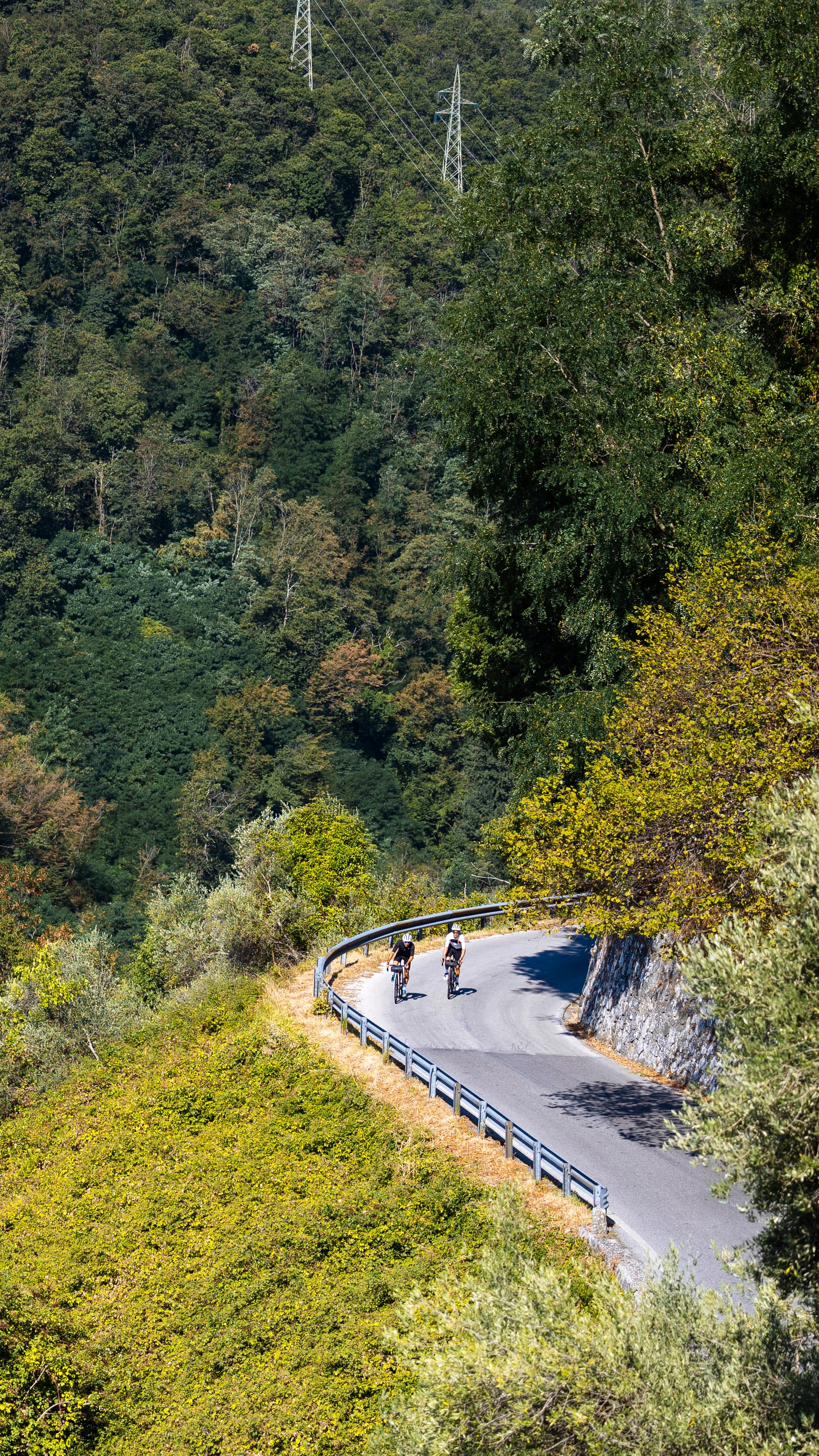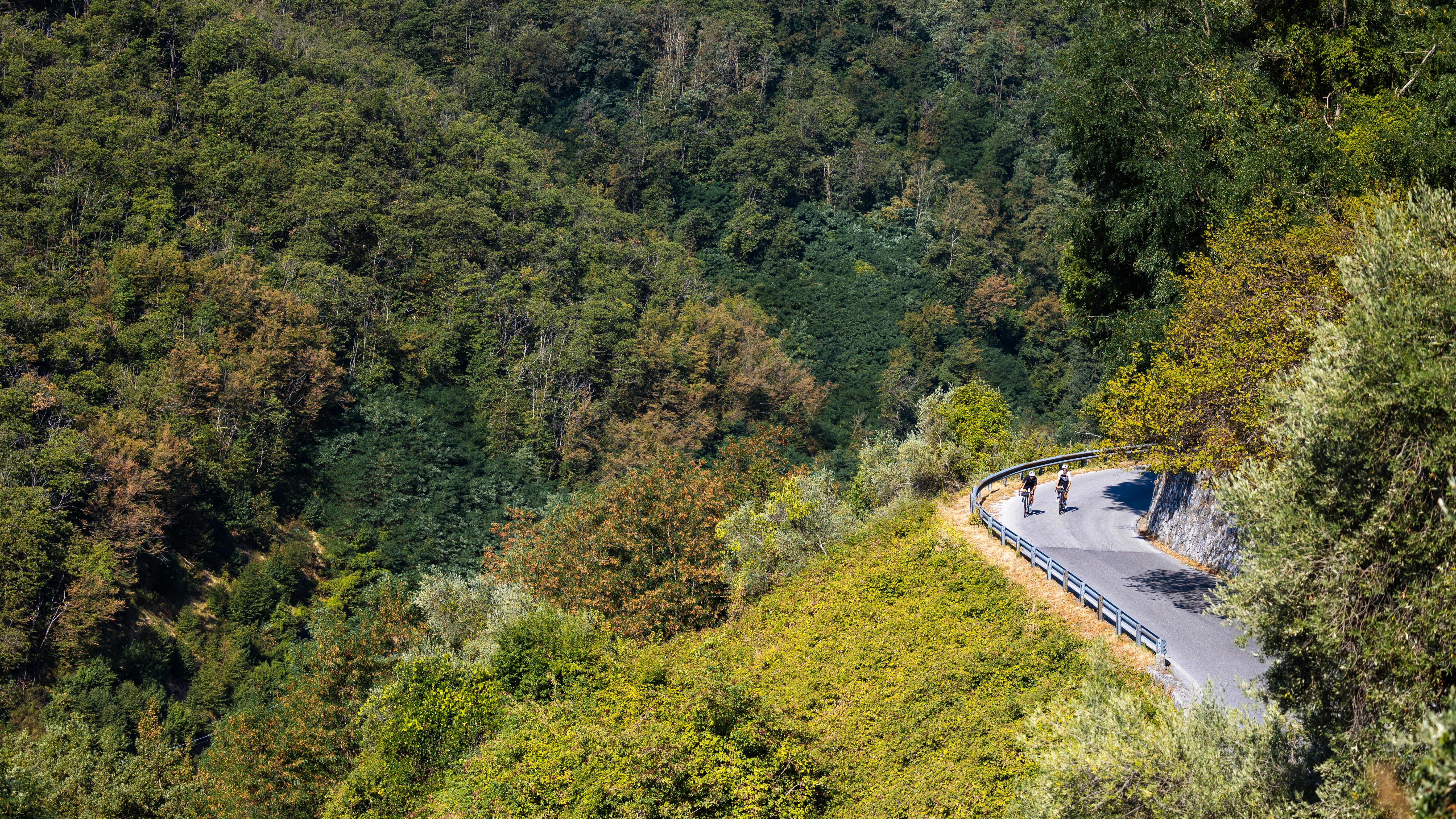 La strada inizia a mordere i polpacci, in alcuni tratti siamo appena sotto il 10%, si entra ed esce dal bosco, da certe curve è possibile ammirare tutta la valle. Villa Basilica, la pieve di San Jacopo, con tanto di torre medievale, ed eccoci a Boveglio: siamo a 745 metri di altitudine. Da qui inizia una lunga discesa verso Bagni di Lucca sempre immersi nel verde. Il traffico è un’idea lontana.